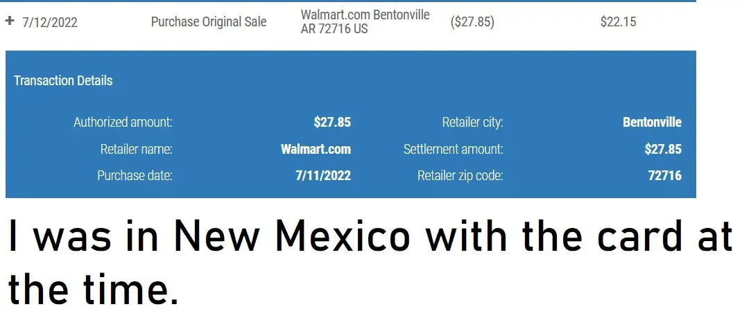 Currently still in dispute, but they have already told me I am out of luck and to 'take it up with who I bought the card from ' . I was in New Mexico with the gift card when it was used at a walmart in Arkansas, Check all the rip off reviews on Amazon, buyer beware. Also, this complaint keeps getitng blocked for some reason? date: 7/11/2022 8.22.22 this legit complaint keeps getting returned as 'missing information' . FU
