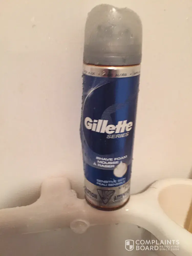 I will attempt to attach photos but I open my sink cabinet to retrieve a can of Gillette Shave Foam. To my surprise there was shaving cream ALL OVER the inside of the cabinet. The can "leaked", not through the "nozzle" which I have had happen prior, but through the SIDE OF THE CAN, as if the cans' seam simply split apart.