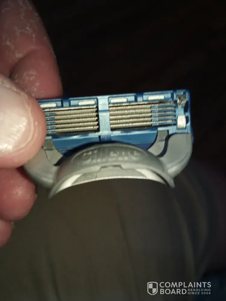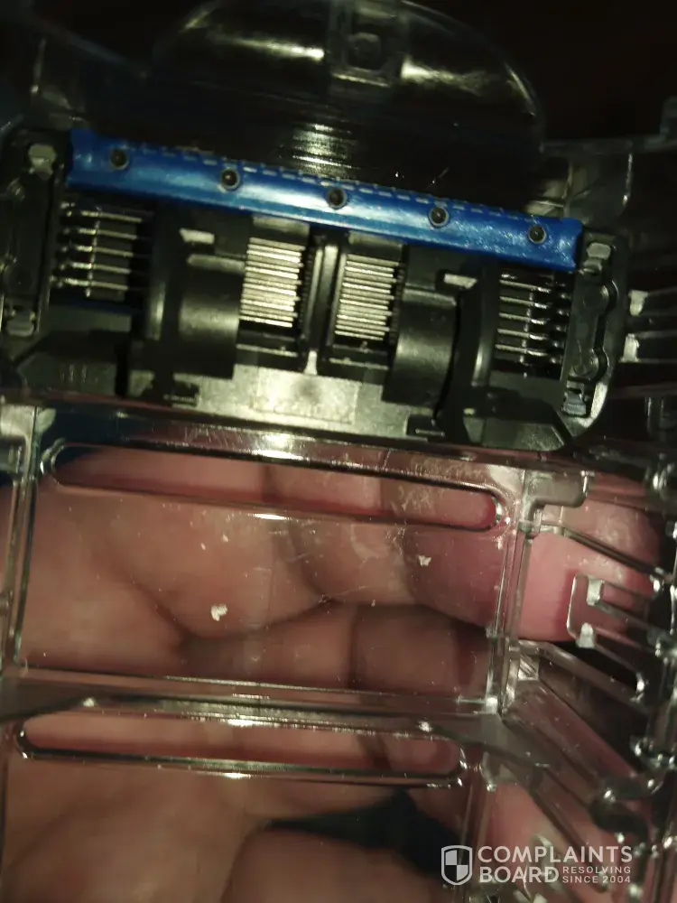 One of your Gillette sensor 2 plus razors (UPC 4740031343) has something stuck in the blades; it looks like another blade piece. When I shaved with it, it hurt, so I stopped. It was in the middle, but I wiped it to look closer and it moved and got stuck towards the edge. I'd like to know how that happened, what it is, and hear how you intend to prevent this from happening in the future. I think I was very lucky. Hope to hear from you soon.