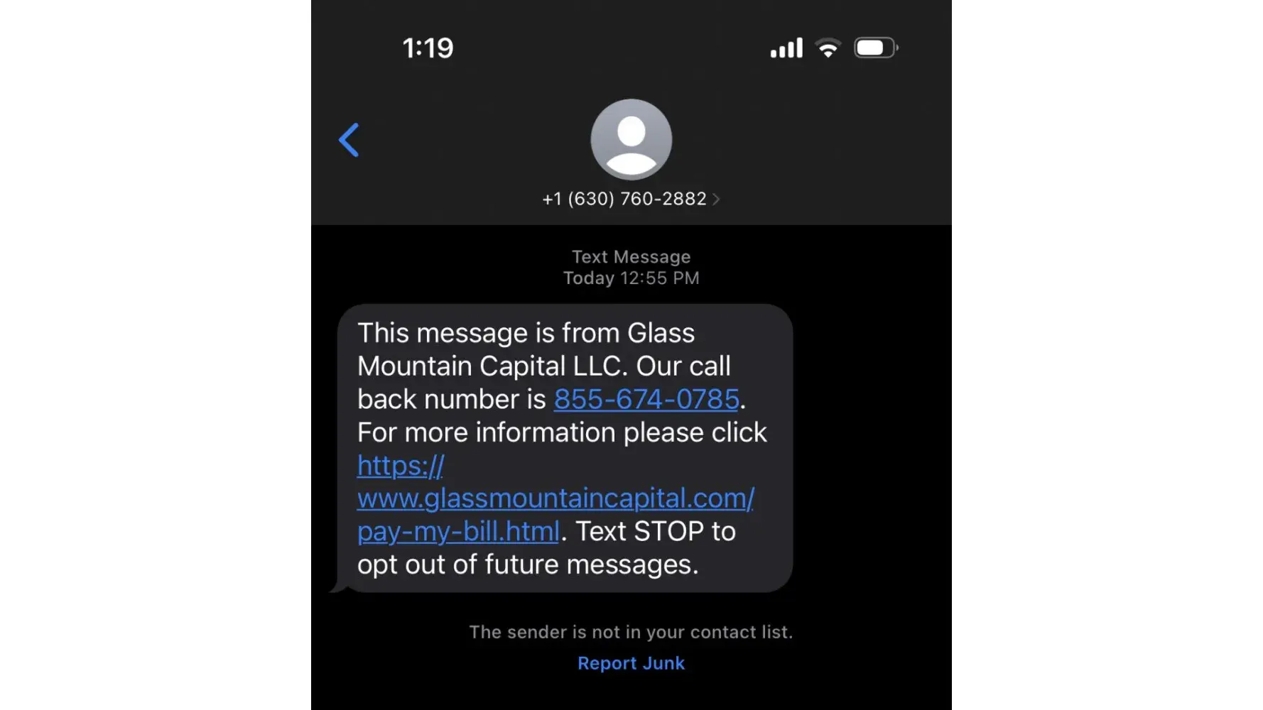 I am receiving texts from Glass Mountain Capital LLC with an attempt to collect a debt