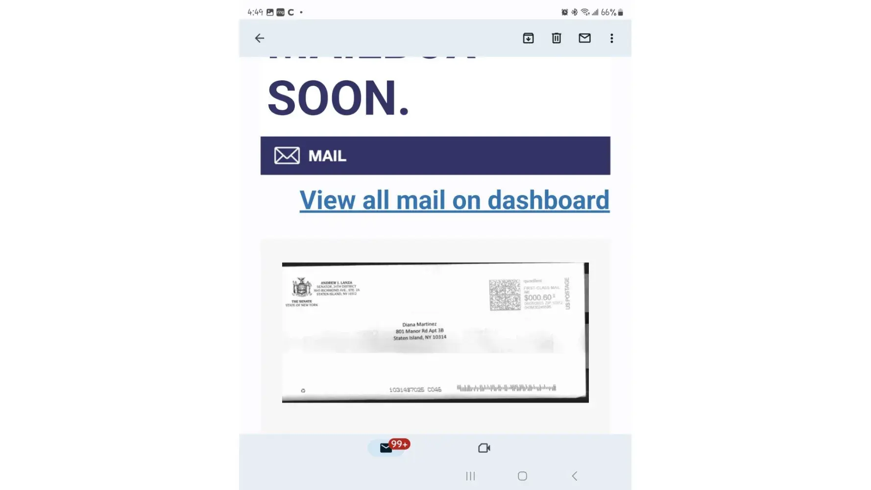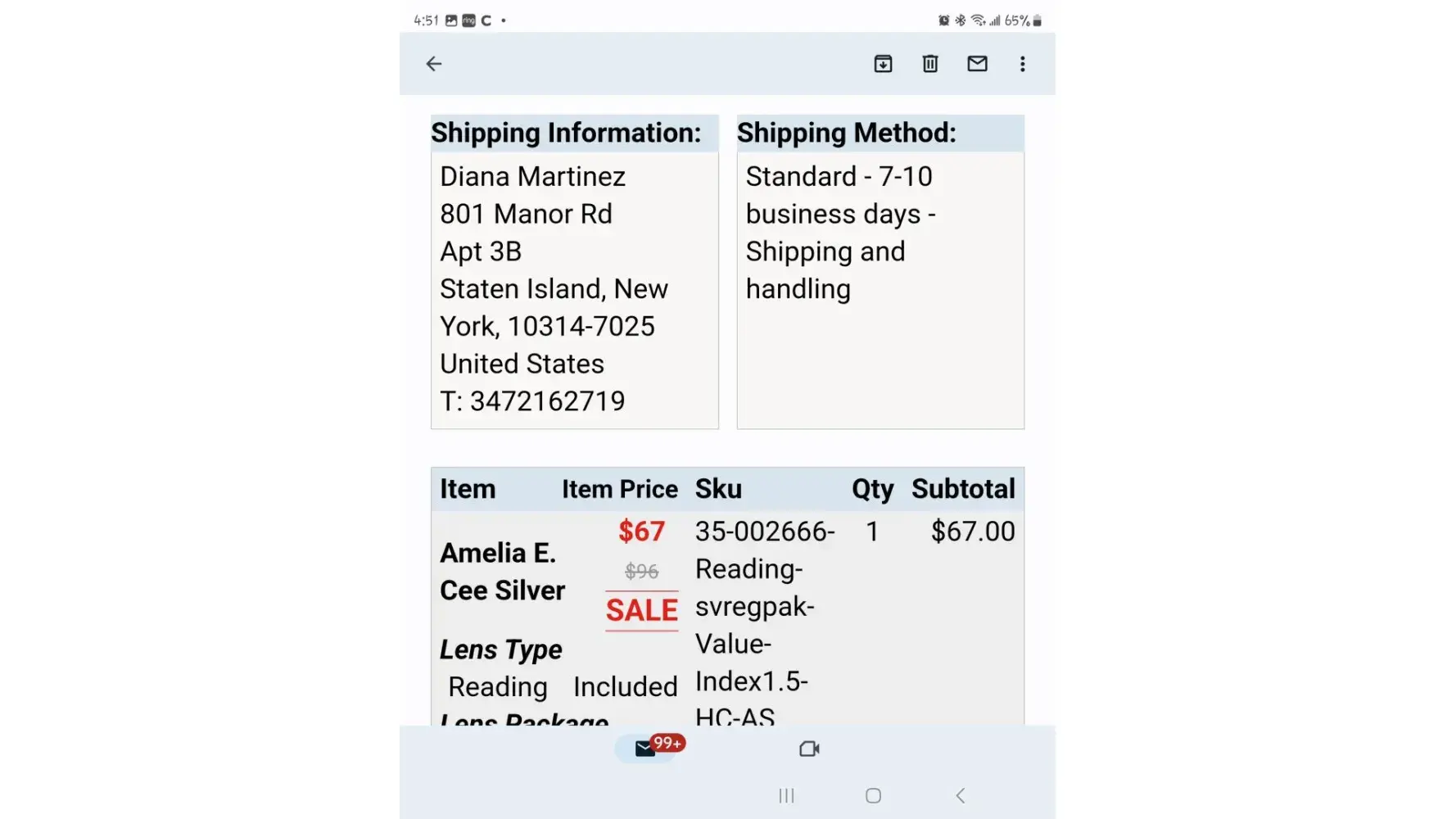 I placed an order for reading glasses on May 31st, 2023 with GlassesUSA. I then received an email that the glasses order was said to be delivered on delivered on June 9th, 2023. The United States Postal Service electronic mail update system emailed me my mail due for June 9, 2023 and the information does not show the package being delivered on the date that GlassesUSA claims.