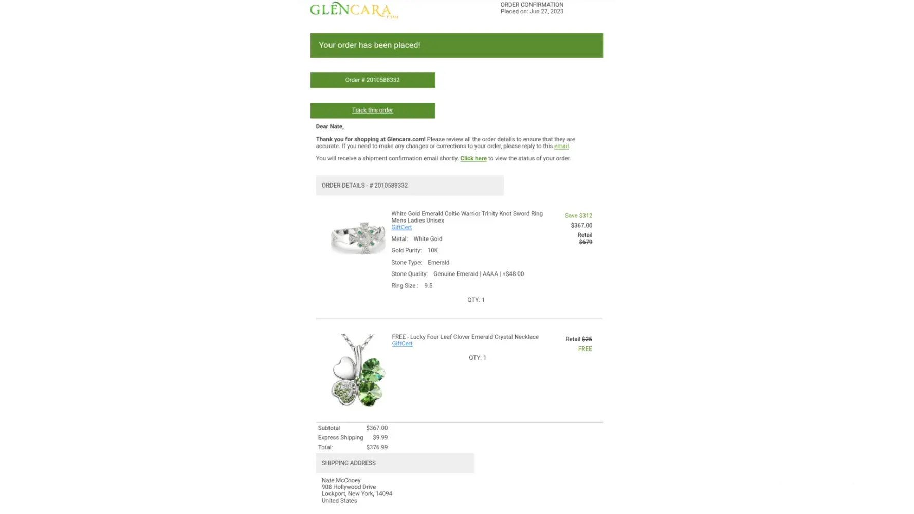 On May 1, 2023 I ordered a Gold Diamond Celtic Heart Necklace for my wife’s May 19 birthday from Glencara. The order confirmation stated its retail value at $8,128, but I only had to pay $4,383 which I did using my credit card. I was told the necklace would be delivered between May 18th and 20th but I didn’t receive it until June 2. It arrived through United Parcel Service (UPS) without the requirement for a signature confirming receipt which made me suspicious. There was not an appraisal with the necklace either which made me more suspicious.