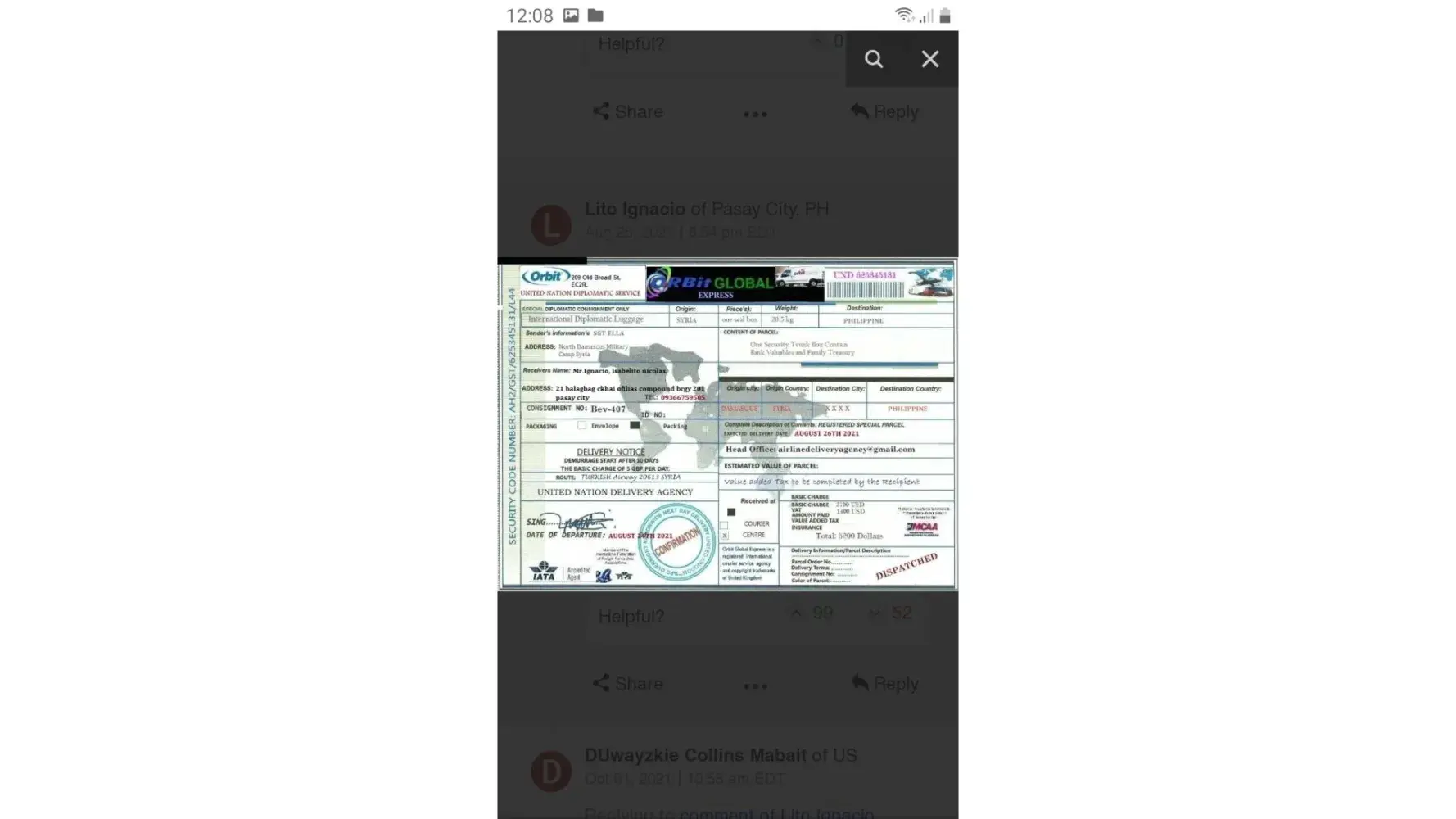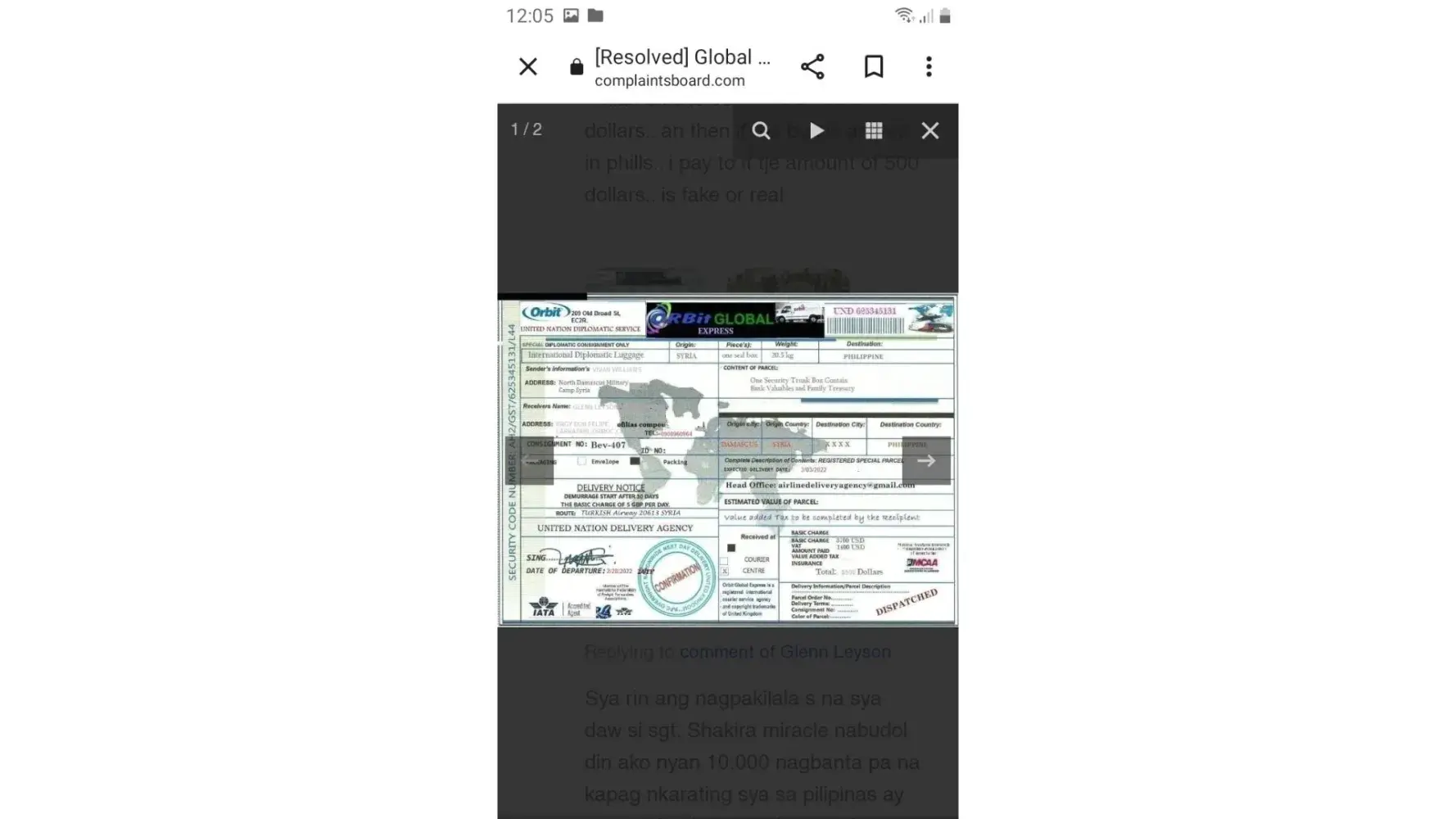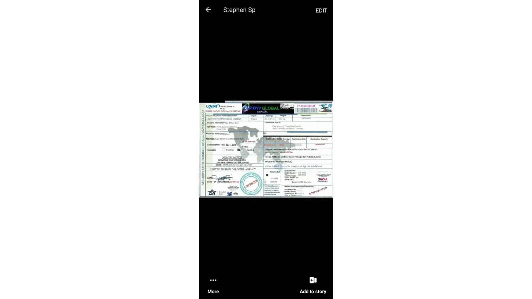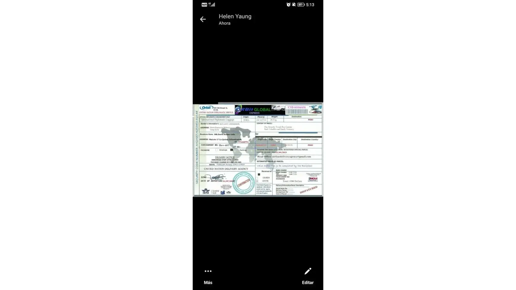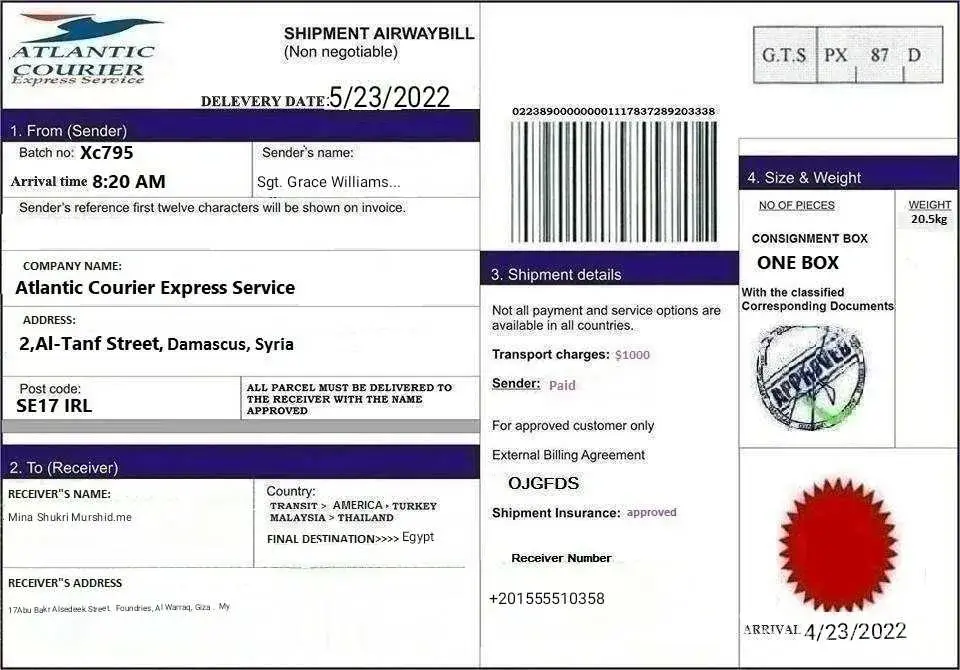 لقد ØªØØ¯Ø«Øª معى وقالت انها اسمي .. الرقيب ستايسي لوبيز .. أنا جندي أمريكي Ù…ÙˆØØ¯ أعمل كقوات ØÙظ سلام تابعة للأمم Ø§Ù„Ù…ØªØØ¯Ø© ÙÙŠ سوريا ØŒ ÙÙŠ Ø§Ù„ØØ±Ø¨ ضد الإرهاب وانها تريد ان تبعث لى بطرد Ùيه اموال تريد ان تعمل بها ÙÙ‰ بلدى وعليه Ùقط Ø¯ÙØ¹ مصاري٠الشØÙ† عندما تتصل بى الشركة وادركت انها نصابه وخصوصا عندما بعثت لى بوليسة الشØÙ† بتاريخ قديم ÙØ¹Ù…لت Ø¨ØØ« عنها وادركت ان Ù†ÙØ³ البوليسه Ø¨Ù†ÙØ³ الرقم لكن المرسل له مختل٠ÙÙ‰ كل مرة وهذة بوليسة الشØÙ† التى ارسلتها لى