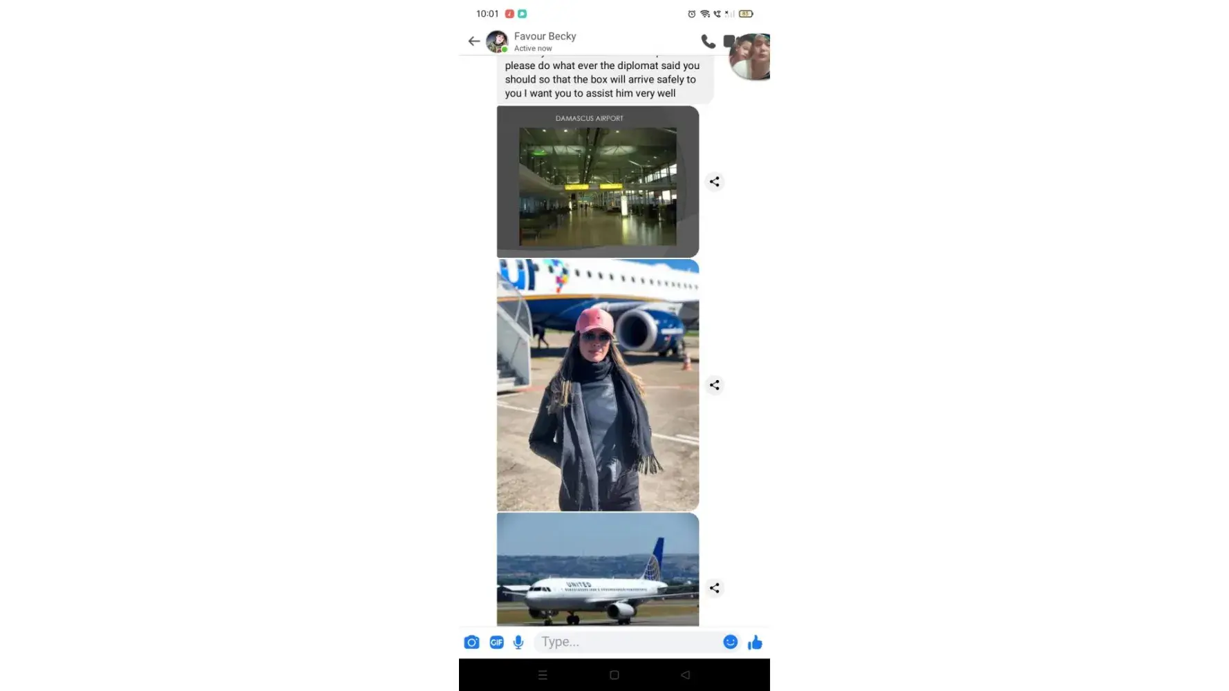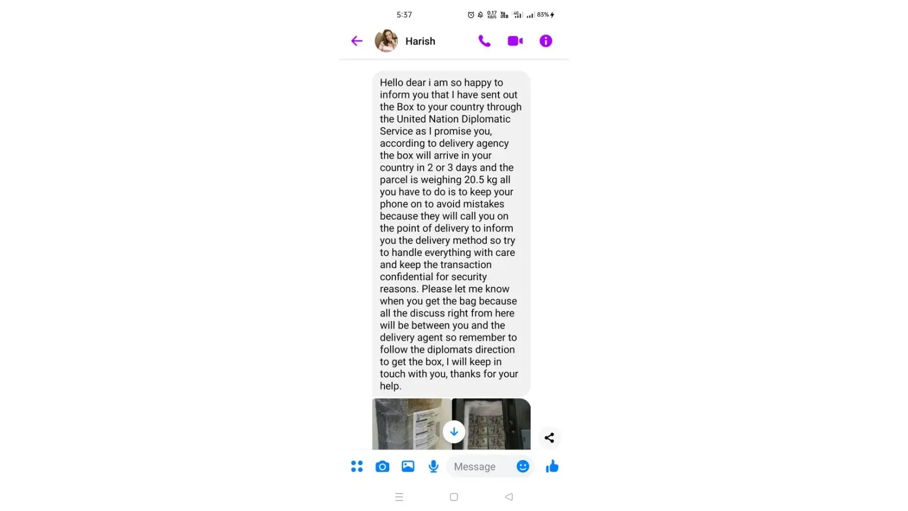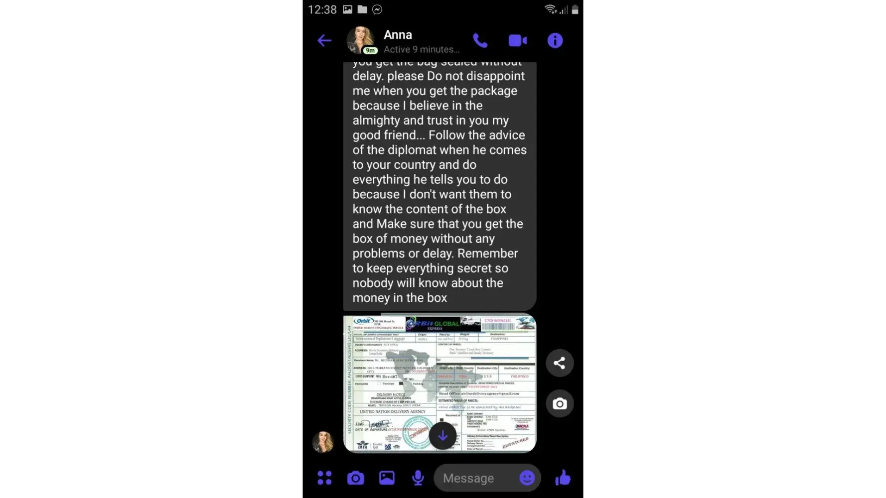 Ø§ØØ°Ø±Ùˆ من هده النصابة تدعي انها سترسل طردا Ùيه الكثير من الاموال من اجل الاسثثمار ÙÙŠ بلدي لكنها مجرد عملية نصب