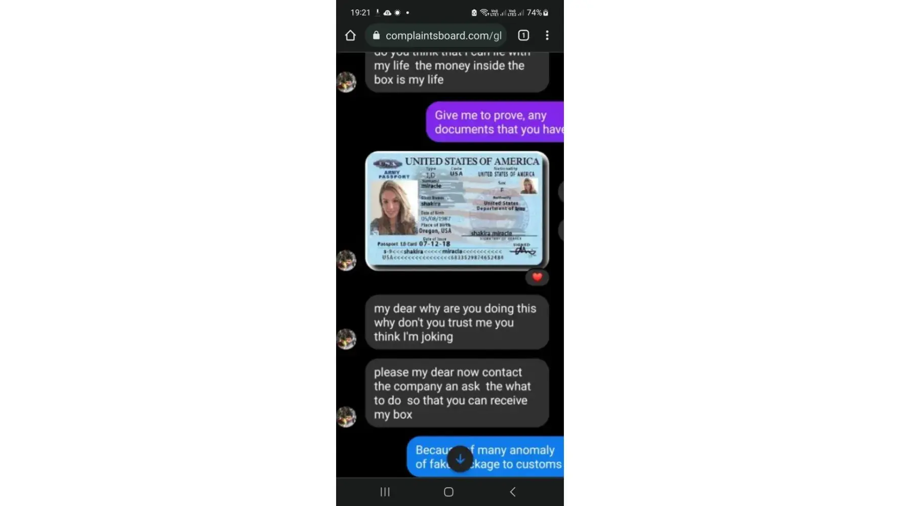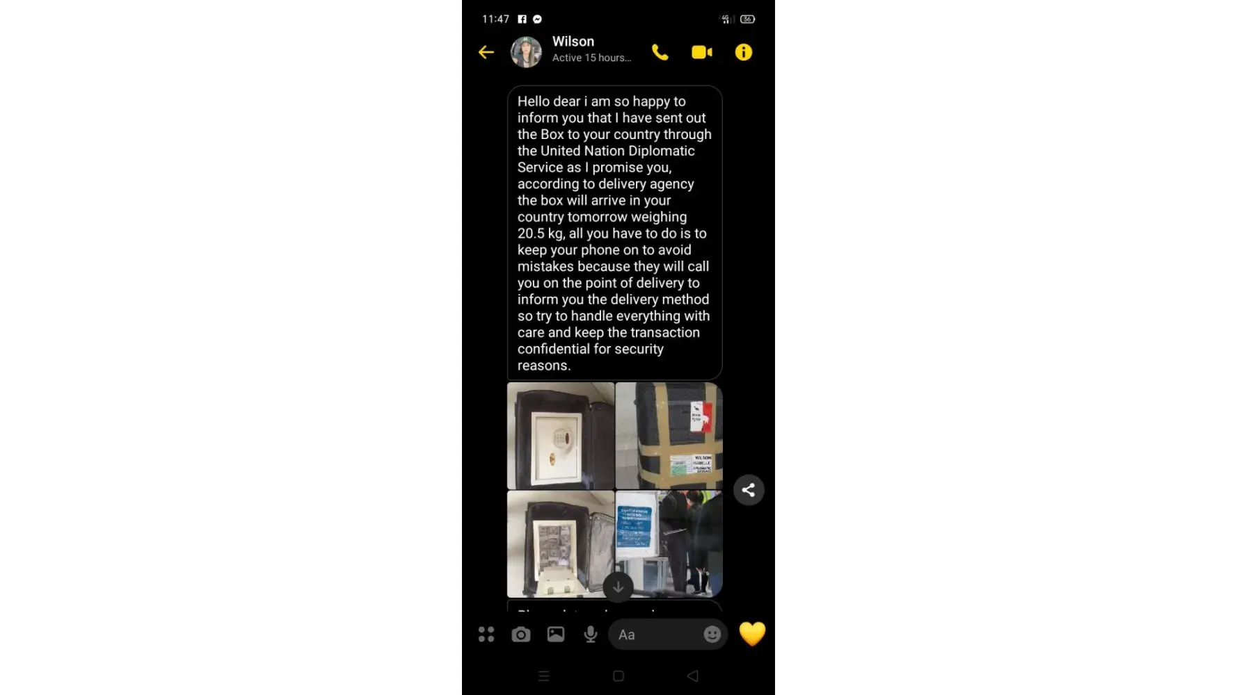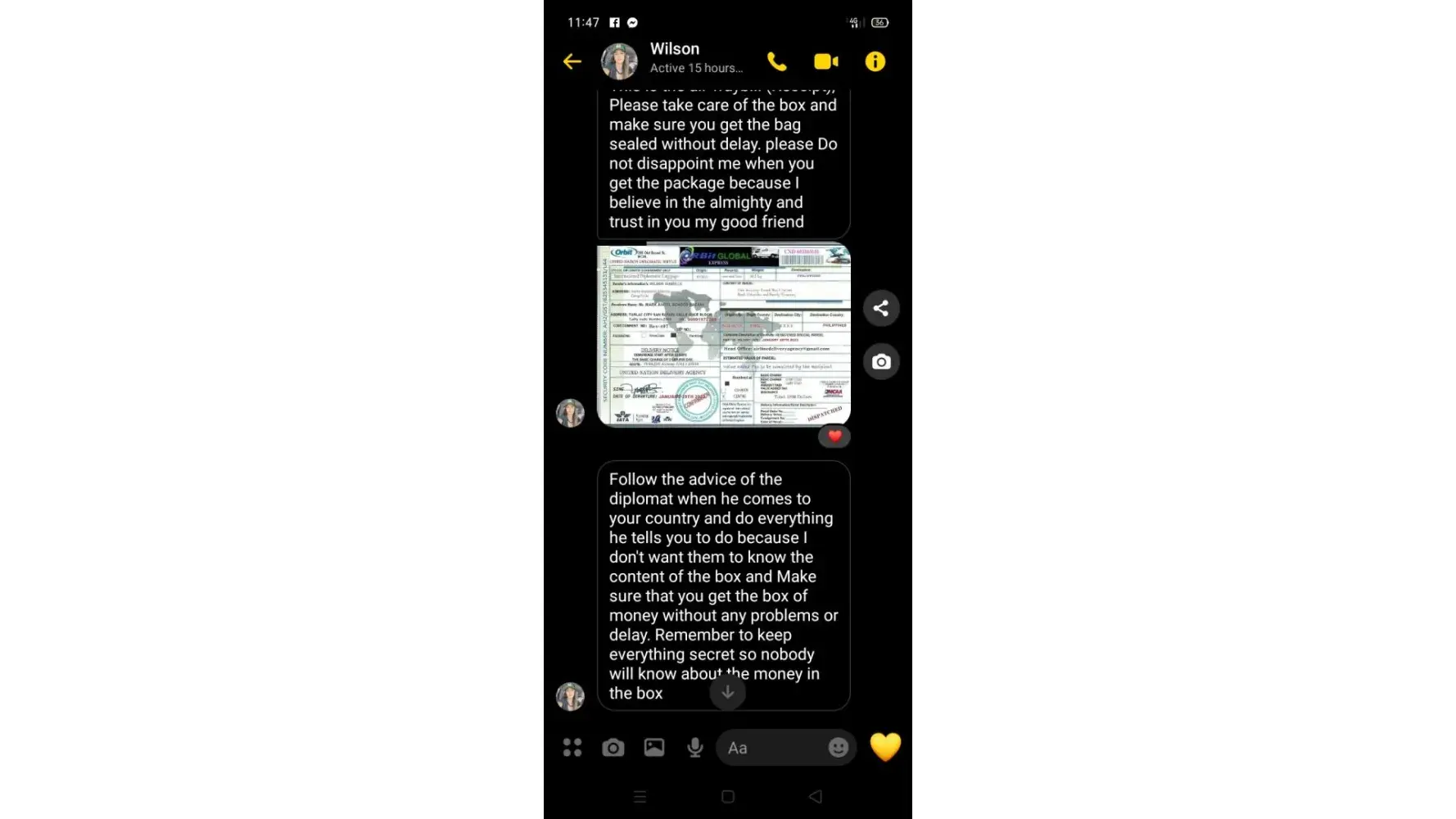 Ø§ØØ°Ø±Ùˆ من هده النصابة تدعي انها سترسل طردا Ùيه الكثير من الاموال من اجل الاسثثمار ÙÙŠ بلدي لكنها مجرد عملية نصب