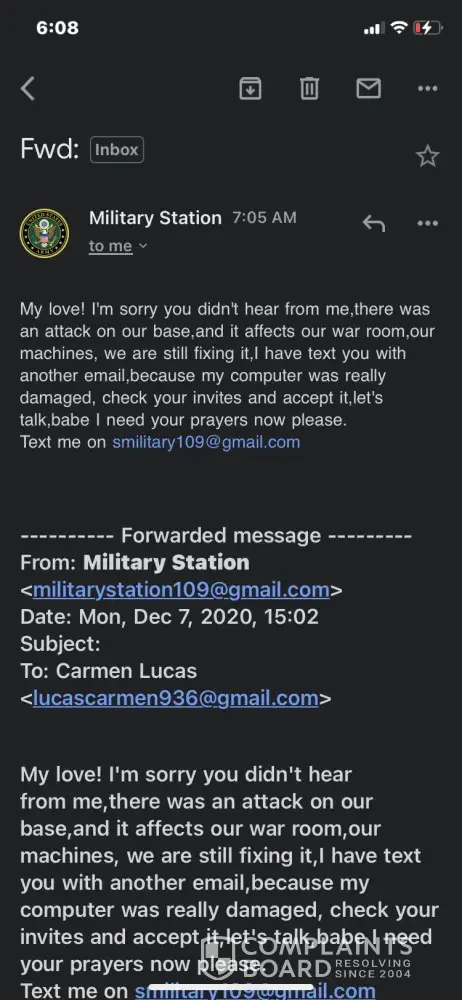 Gentleman in the army stationed in Yemen Gabriel Howard Cunningham Martinez a That he had gold & money He needed help to get his package home. Single dad had 3 boys. He wanted to retire. threatened I would go jail. Courier always need money.
