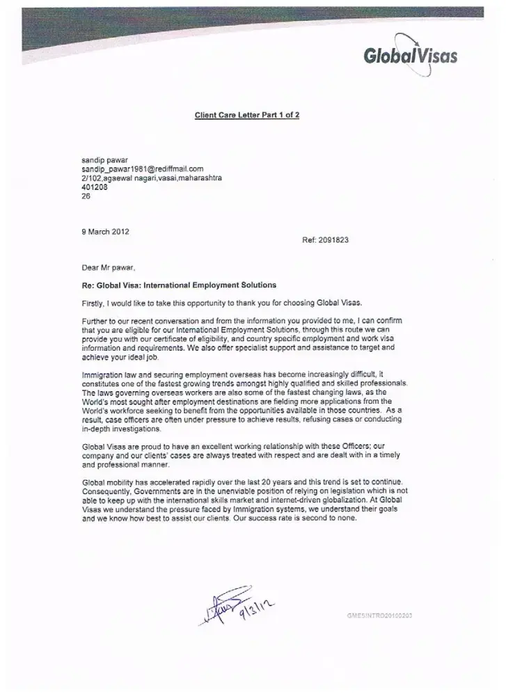 On 16 March, 2013 I stopped GLOBAL VISAS for all the services and hard work which they are providing me from last 4 months as I was totally disappointed. I just asked my case worker about refund policy as I didn’t receive any written agreement and next day she sent me an email regarding to the ‘UNSUCCESSFUL REFUND’ according to the terms and conditions of FAKE CLIENT CARE LETTER which GLOBAL VISAS got ticked by me FRAUDLENTLY.I initiated a written complaint to them as I am unable to speak or see personally any manager or directors, they don’t allow me and they have taken all the payments which is mis- sold of their fake services and fraud on the name of immigration. I got same response as ‘according to client care letter, they have provided me all the services’ and my account is closed.