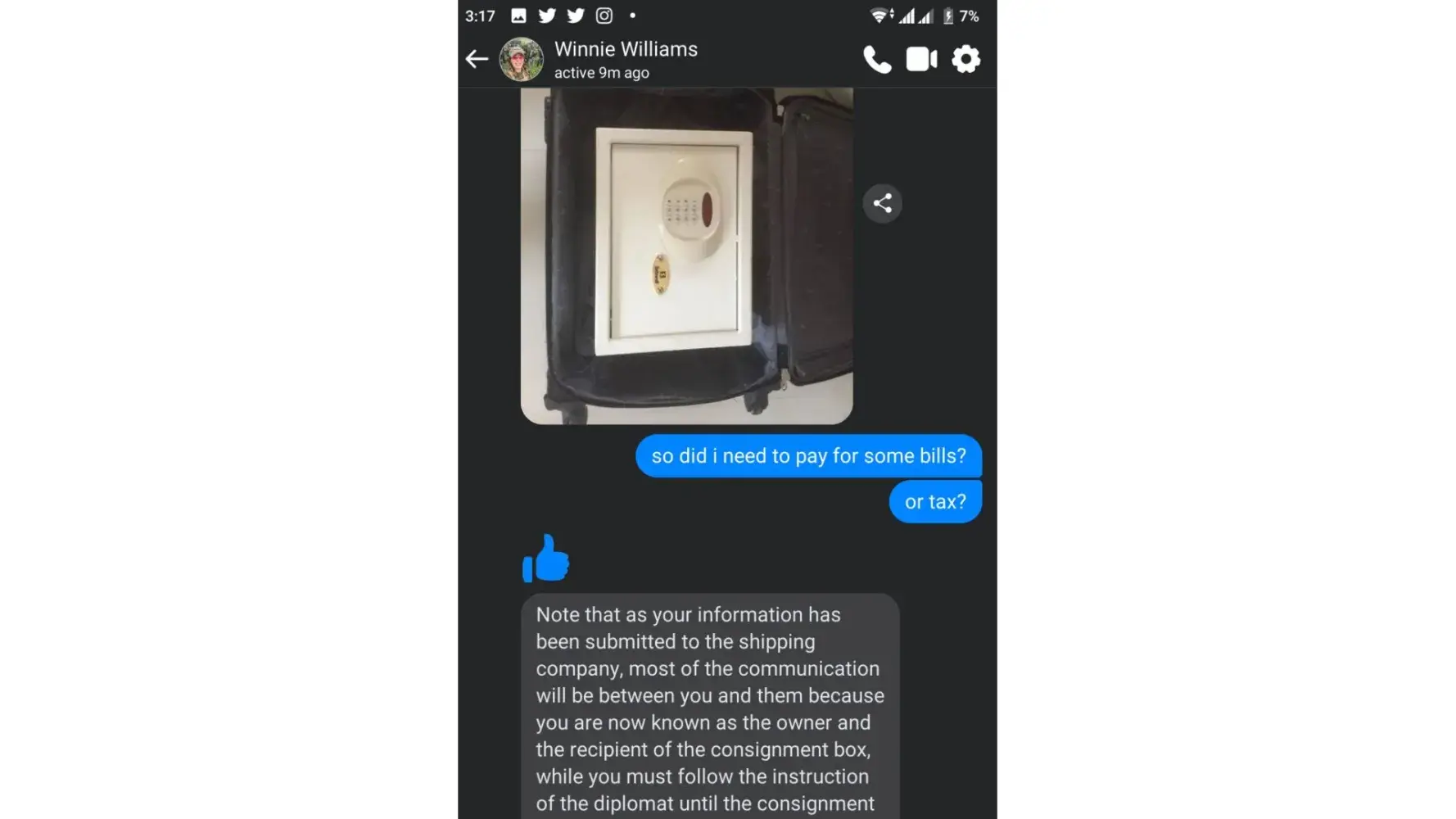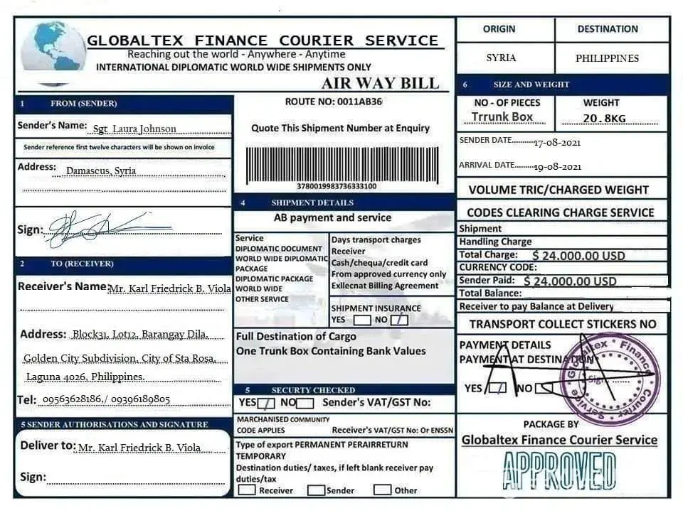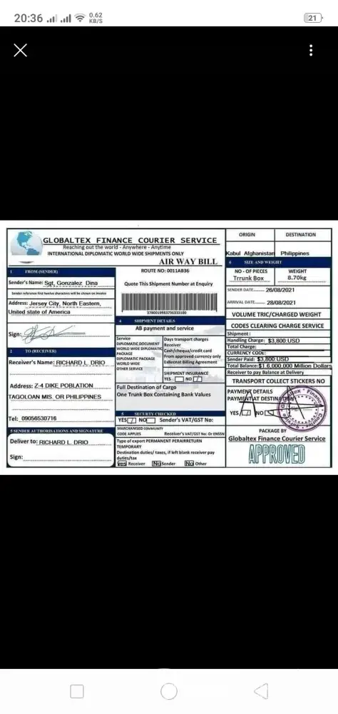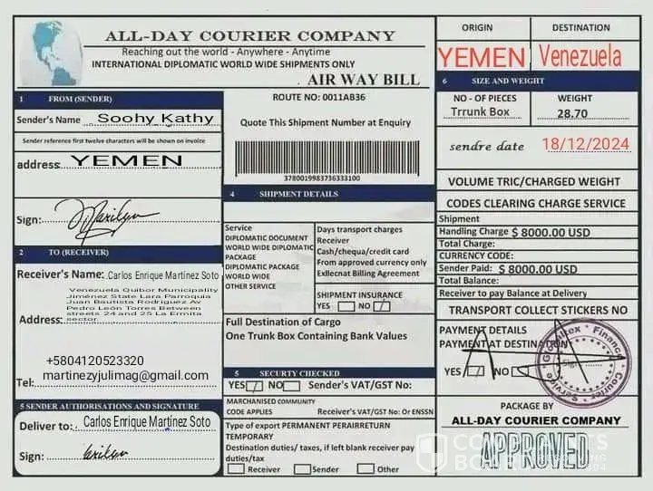 Why not send the box without anything the receiver to pay for? if it legit why agent ask money for the one who receiveth? I am just curious about... I smell like fishy! some kind of froud. inside the box some kind of huge of money... but cannot afford and shoulder to pay it all... wow! an amazing cript of craft and scratch! tell it to the marines!