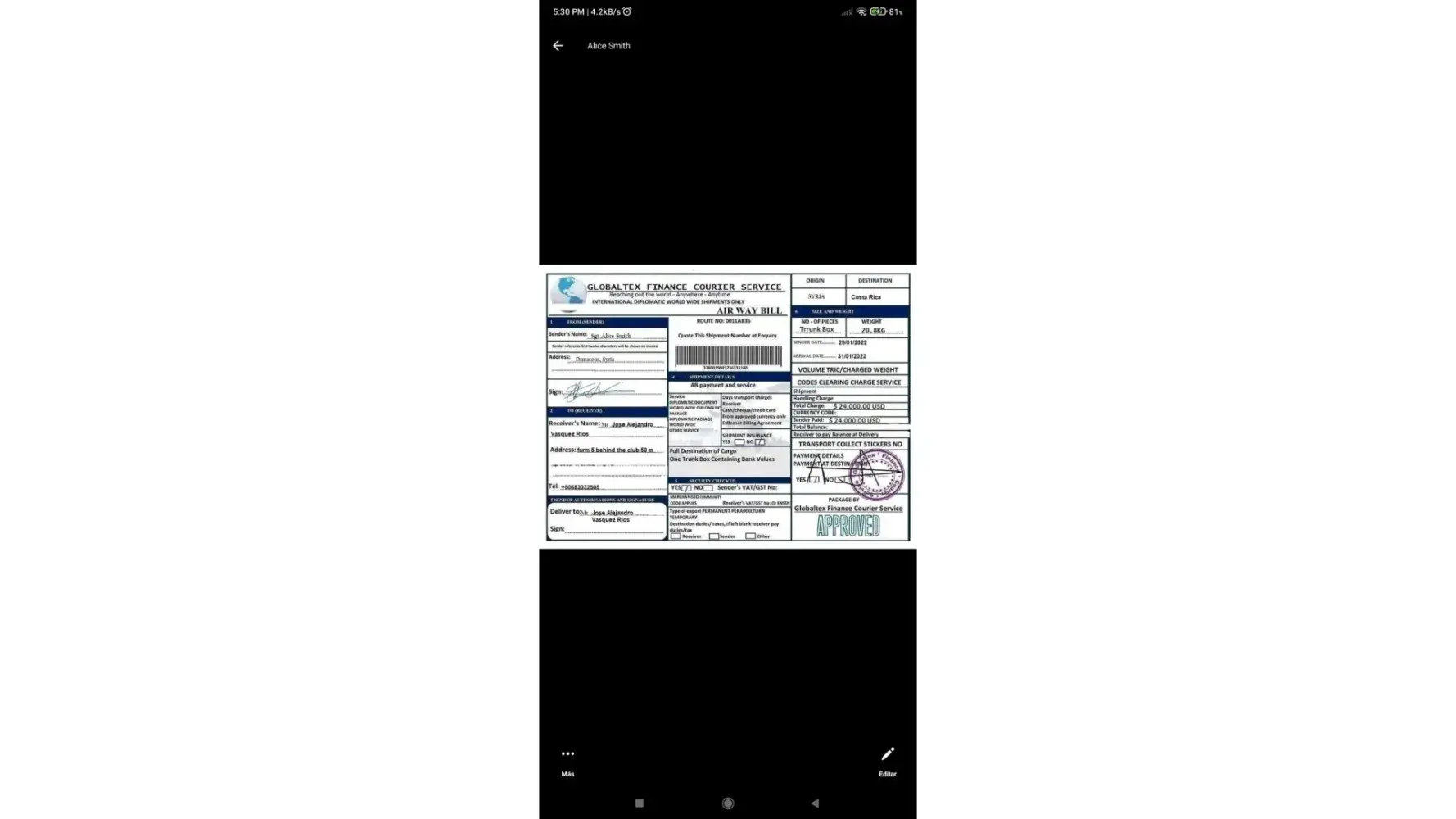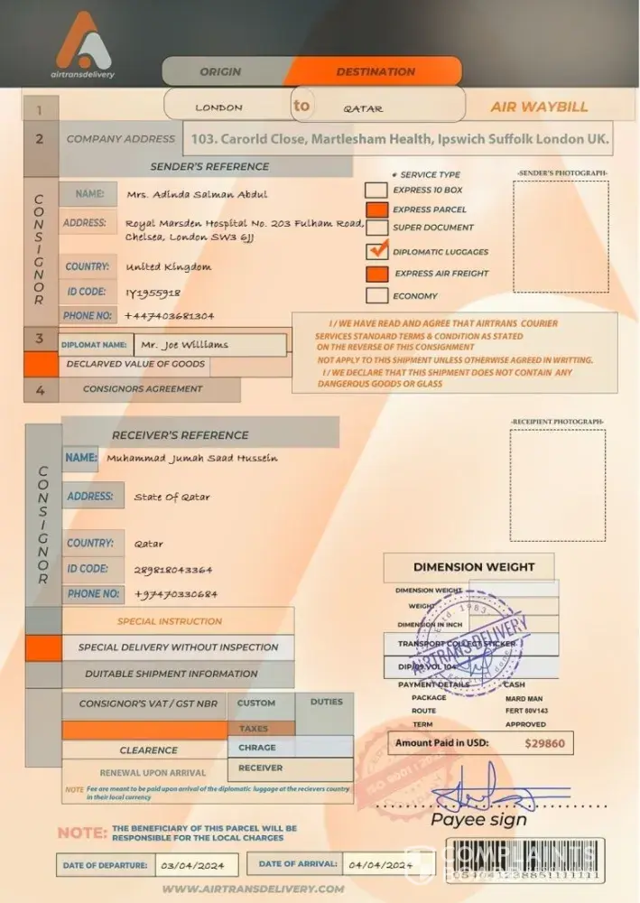 It's scam, it is the same signature I have with the parcel sent to me but of diferent name on it.