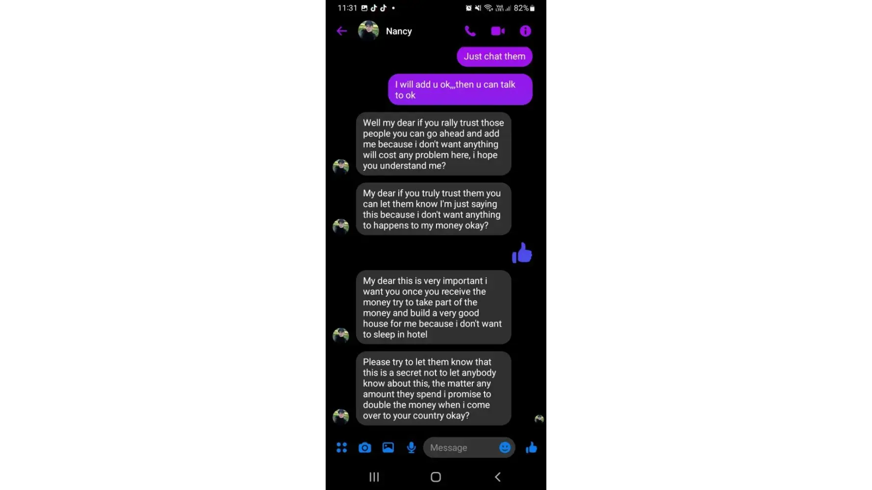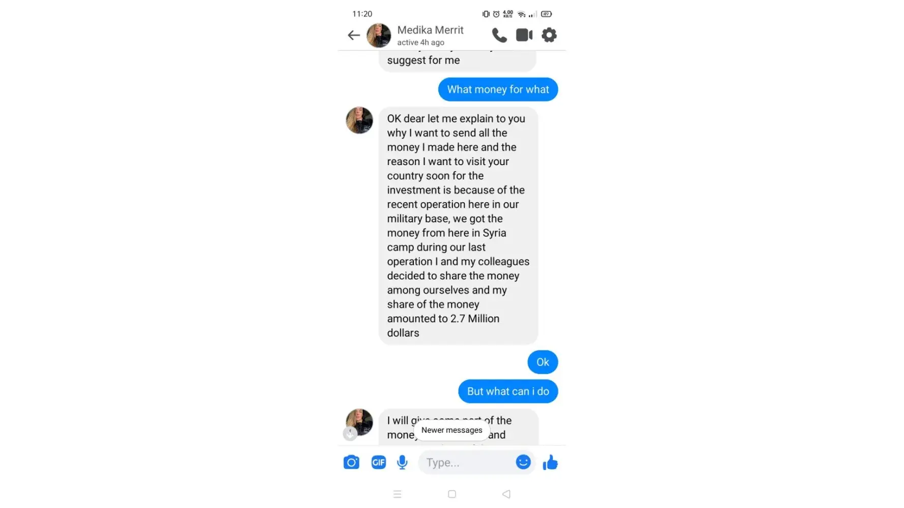 Hello brother I need to know about it it's very important a military girl forcing me to send some money please help me bro what I have to do
