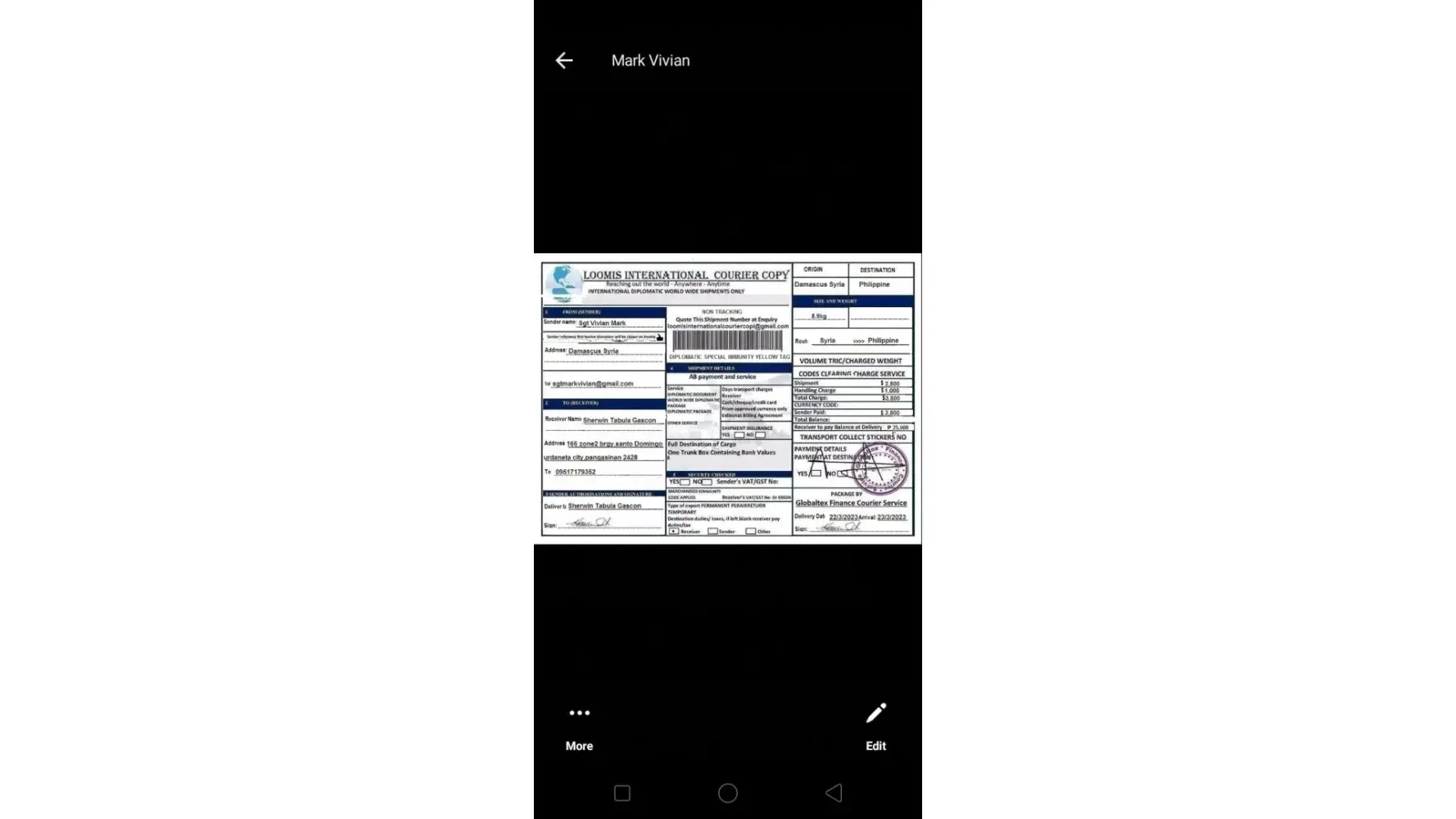 I would like to ask and wish for the trruth answer, pls! Do i need to pay the diplomat service from there in your branch at Damascus Syria, whenever it arrives to my country Philippines? For amounting 25, 000 PHP, for custom payment here in airport?