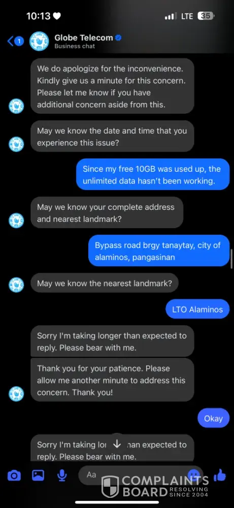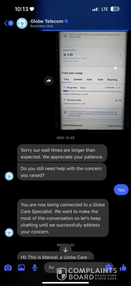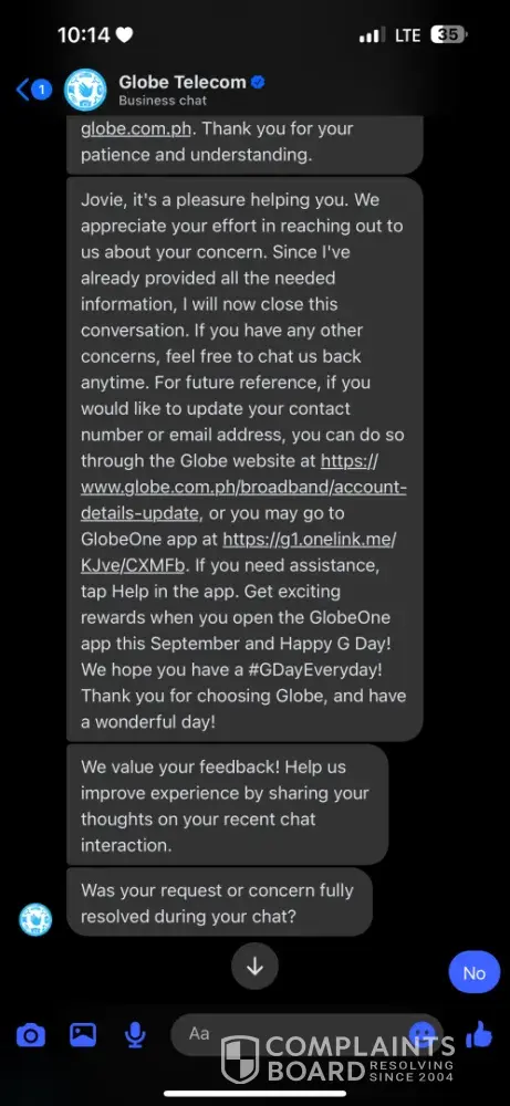 - While Globe Telecom has a high level of trust, our investigation has revealed that the company's complaint resolution process is inadequate and ineffective. As a result, only 5% of 641 complaints are resolved. The support team may have poor customer service skills, lack of training, or not be well-equipped to handle customer complaints.