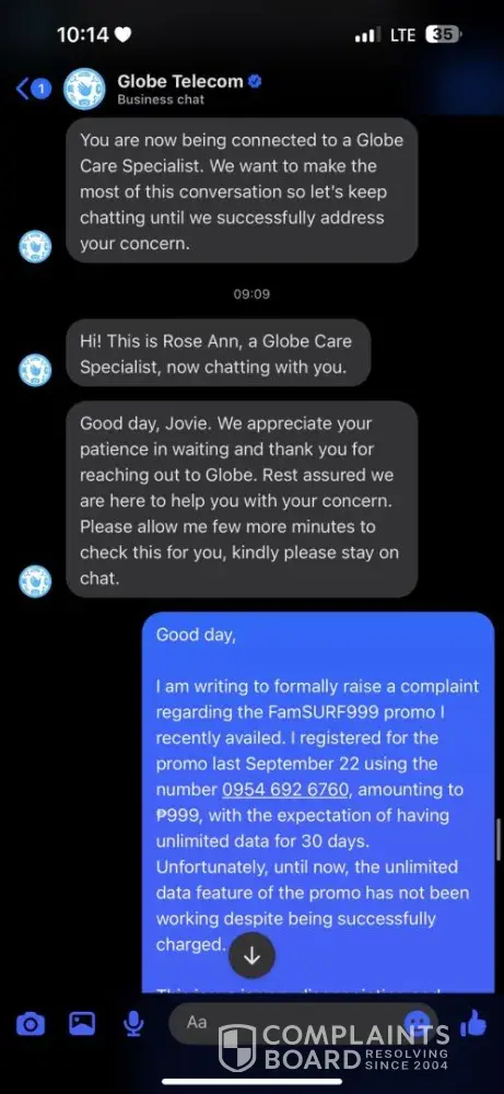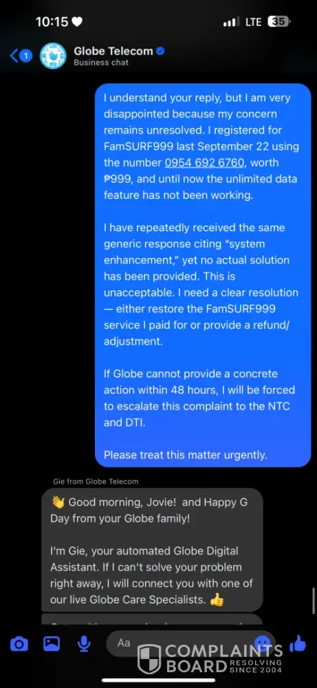 Good day, I would like to file a formal complaint against Globe Telecom regarding their FamSURF999 promo. On September 22, 2025, I registered for FamSURF999 using the number [protected], amounting to ₱999. The promo should provide unlimited data for 30 days, but until now, the unlimited data has not been working despite being successfully charged. I...