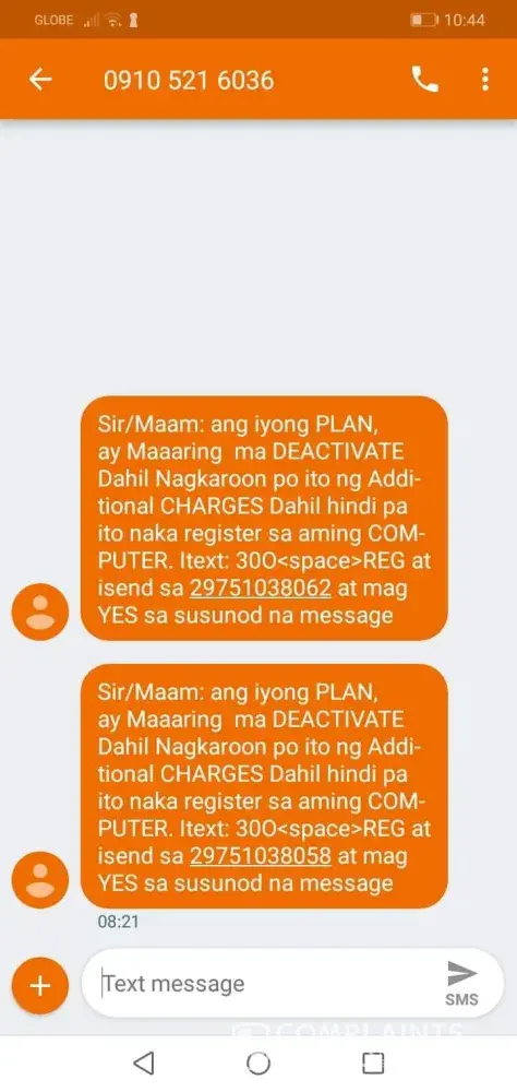 I have been a postpaid costumer of globe for the past 4 years. After I have recontracted my plan and added a new additional line last april 16, 2019. While my recontracted plan with new phone was successfully processed with up to date advices and messages, I was surprise to not receive the same kind of advices and messages for the services to be inputted in the new line and phone. Instead, I have been receiving a regular text messages from different numbers 09125422809, 09105216036, 0912 542 2705, 0912 535 7318, 0910 521 6049, +63 912 522 2367, +63 912 107 4403 and more.. With almost the same kind of advice that: I still need to register the plan because it might get deactivated because of additional charges and because this number and plan is not yet registered in "our computer". To me this is clearly an inside job by some of your globe employees who have access to sensitive information. I seek explanation and clarification for this continuing incident. It is not right, it violates my data privacy and it creates undue stress to your user. I have screen shots of all messages uploaded below. Please do something to correct this.