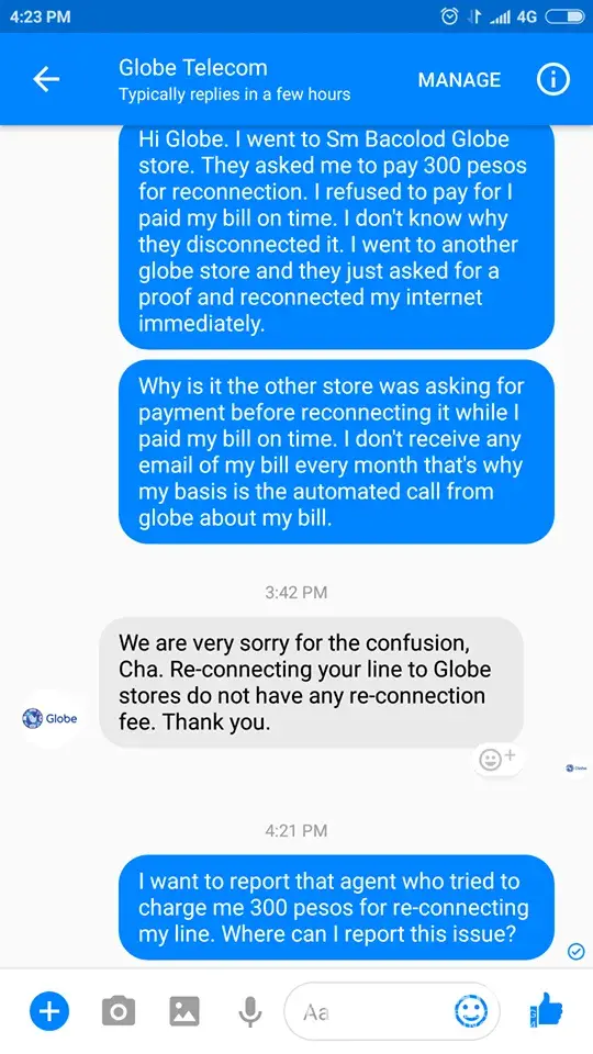 I received the automated call from Globe about my bill on July 1st, morning. I paid the said amount, same day, evening via Gcash. Right after that, I sent a message on Globe facebook account to ask if my payment was successful. And have told me that once I received a confirmation message it means it was successful. But yesterday, June 8th, my connection was suddently disconnected. I sent message to Globe immediately, but I got no reply. So I decided to go to Sm Bacolod Globe store. I talked to one of the customer service to ask about this issue, and I was so shocked when she ask me to pay for 300 pesos for re-connecting my line. What for? I paid my bill on time. Why do I need to pay for that 300 pesos? She did not explain to me why was my connection disconnected she just immediately ask for 300 pesos to reconnect my internet. I refused to pay for she did not give any more details about it. She gave me the Globe hotline instead and told me to talk to them and ask for free re-connection. I did not get her name, but my reference number was A1011 July 8, 2017 11:08am Globe Sm Bacolod. After that, I went to another globe store near my apartment. She just looked on to the confirmation message of Gcash and immediately reconnect my line for free. That fast. No more fees. She also explained to me why this thing happened. So I felt confuse, why the two stores have different way of dealing with this issue? Why do I need to pay to the other store? That were the questions I have so I ended up sending message to Globe again via Facebook messenger, and look, they told me that re-connecting my line in any Globe store does not charge any amount. So what does that customer agent trying to do? That's definitely illegal and not good for the company. She maybe doing that to other customer as well. I really want to report that agent for her to learn her lesson. I hope globe will take action to this issue.