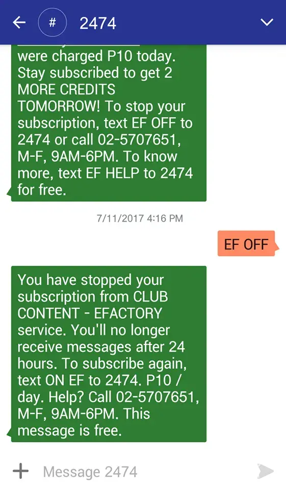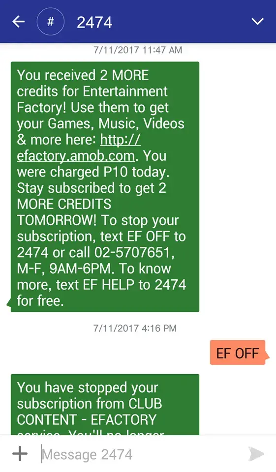 This is not the first time this happened to me but many times and i'm getting fed up with what is happening. I recently loaded P50.00 to register for a combo promo which cost P49.00. Then this text message from EN Factory (Text not Data usage) was suddenly received. To my dismay I was immediately deducted with P10.00, the timing is just perfect to ruin my day since i wanted to register to a service and be able to send message to love family but it happened the urgency of my message was not sent due to lack of balance to avail the registration. I am not sayin i've been robbed but i never subscribed to any of the promos so i should not be getting any deductions at all. This should not be happening as this is a direct violation to any users/customers. My number is [protected]. I know your data center keeps transaction and you can get evidence for yourself but this is my appeal stop doing this and you will never be faced with suits. Again, i never subscribed to any promos so i should not be receiving any unwanted promo advertisement.