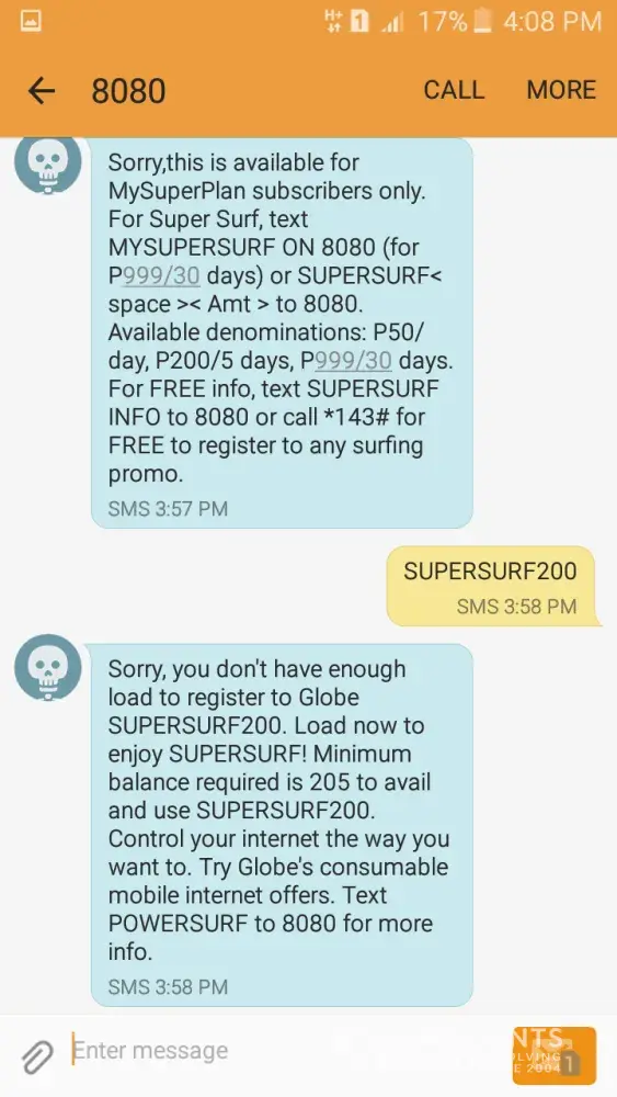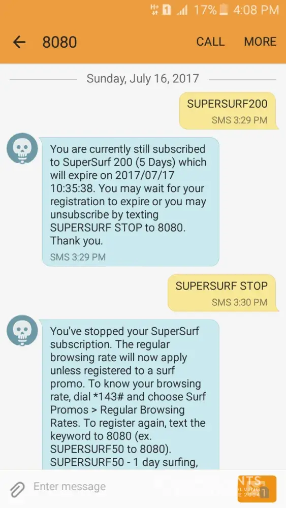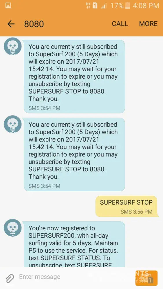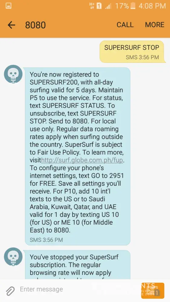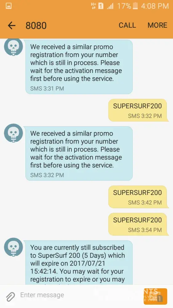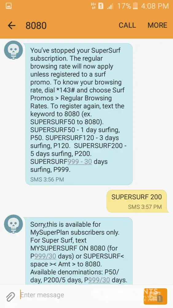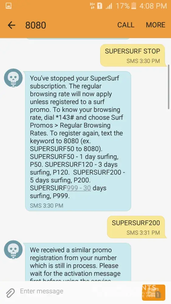 But, it said that i'm still currently subscribed that's why I texted supersurf stop. after it stop, I register to supersurf200 but no response. 3:54pm, I register again in supersurf200 but it replied again that i'm still subscribe. so I texted ssstop again but it replied i'm registered but few seconds later it stops.