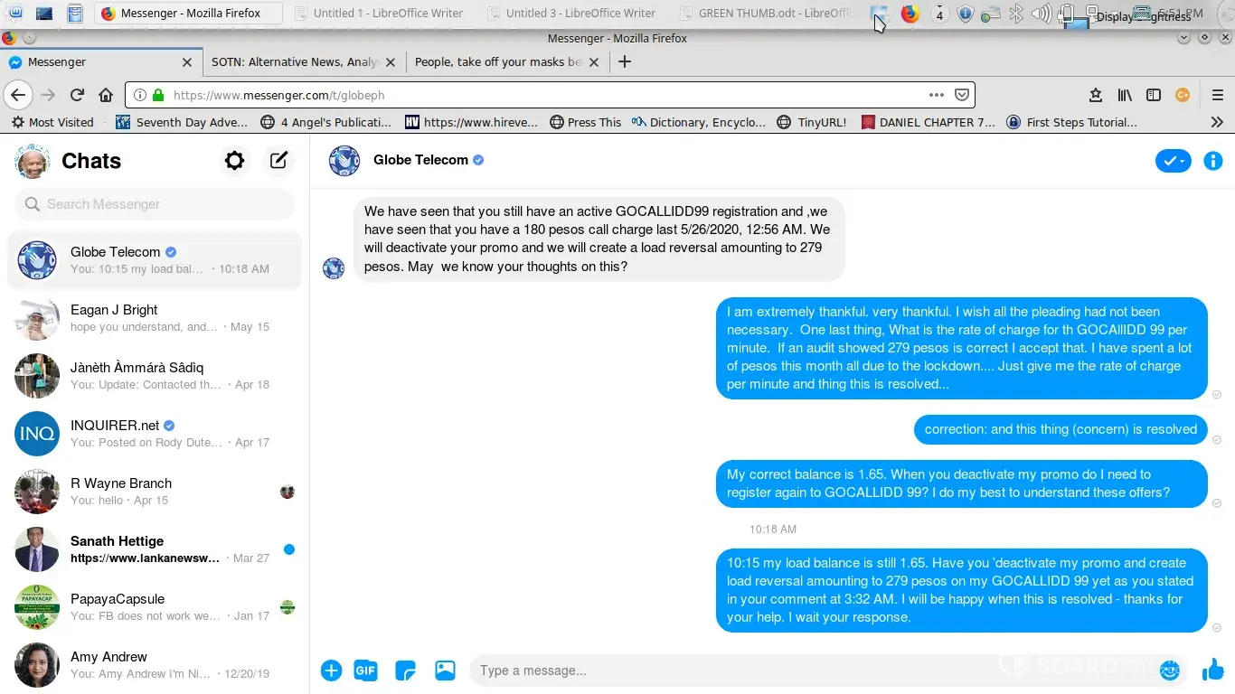2:40 AM Wednesday: it is now 23/hrs+ since a Globe representative in Facebook Messenger replied 12:56 AM. We will deactivate your promo and we will create a load reversal amounting to 279 pesos. May we know your thoughts on this? I replied a thank you message, but the load reversal has happened in more that 23/hrs. I will now submit an official complaint to DTI this morning. I am still open for a resolution as I need my international phone service.