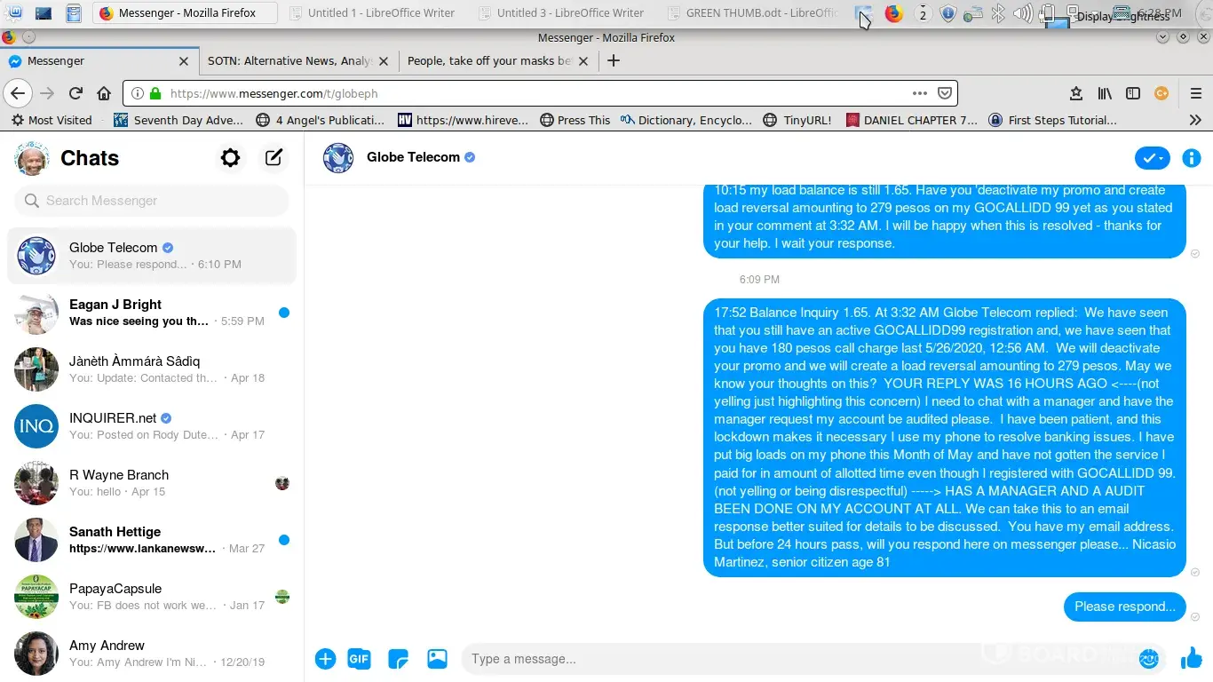 02:47 I just posted this Facebook Messenger text to Globe Telecom: 2:40 AM Wednesday: it is now 23/hrs+ since a Globe representative in Facebook Messenger replied 12:56 AM: