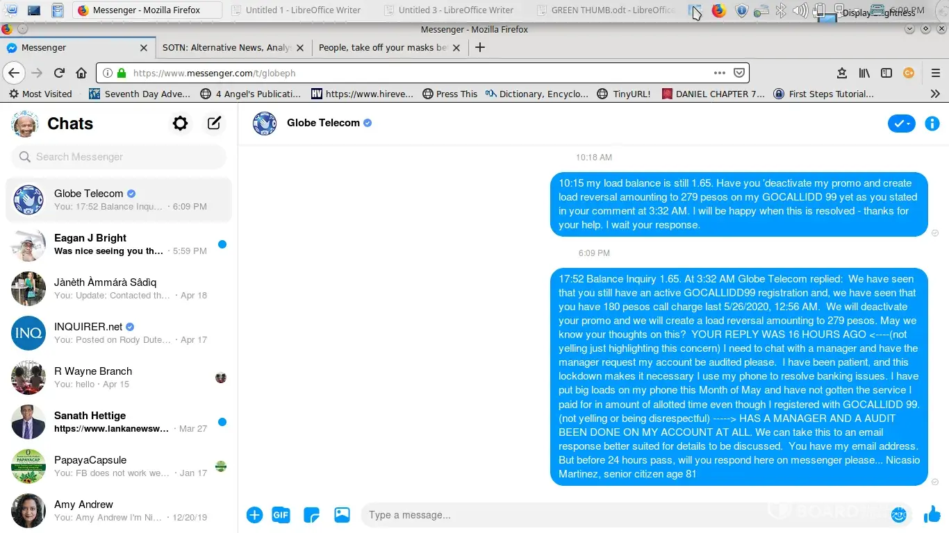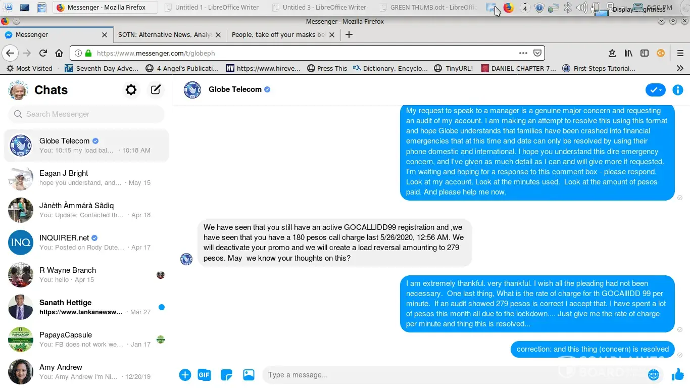 First I'm a senior age 81. Due to the lockdown I must depend on my Globe GOCALLIDD 99 prepaid service to resolve banking issues with BOA in the United States. During the month of May I have put a large (for me) sums of pesos and have not gotten the time of service for the funds paid. I'm requesting and audit of my account (63 927.016.6238) and to have a manager respond to me in https://www.messenger.com/t/globeph which has not happened.