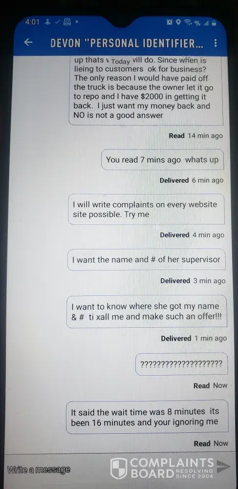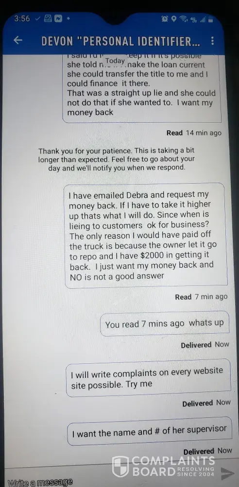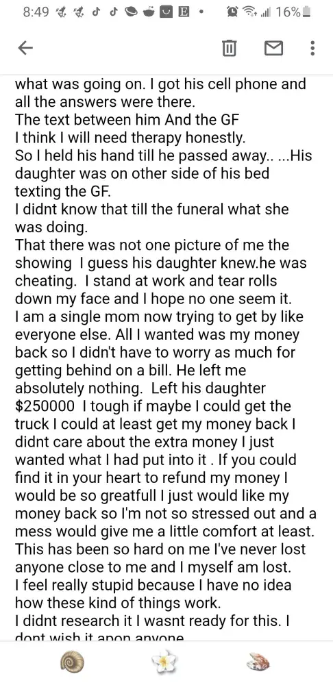 I figured she was going to chew my butt for the returned payment. So May 21 I return her call. She proceeds to tell me if you make the loan current she can transfer the title to me and I can finance the truck in my name… So being out $2000 I took my whole check and 1/2 last weeks check $954 made the loan current. After the payment clears, she proceeds to tell me there's less than a year of payments left on the loan that I don't qualify for transfer. She knew all along she could not transfer a deceased persons' property. I want to know, since when is it ok to lie to someone from a business standpoint. I have asked her nicely to refund my money. I have also chatted with customer service and since he is deceased they can not talk to me about the loan But they took my payment.