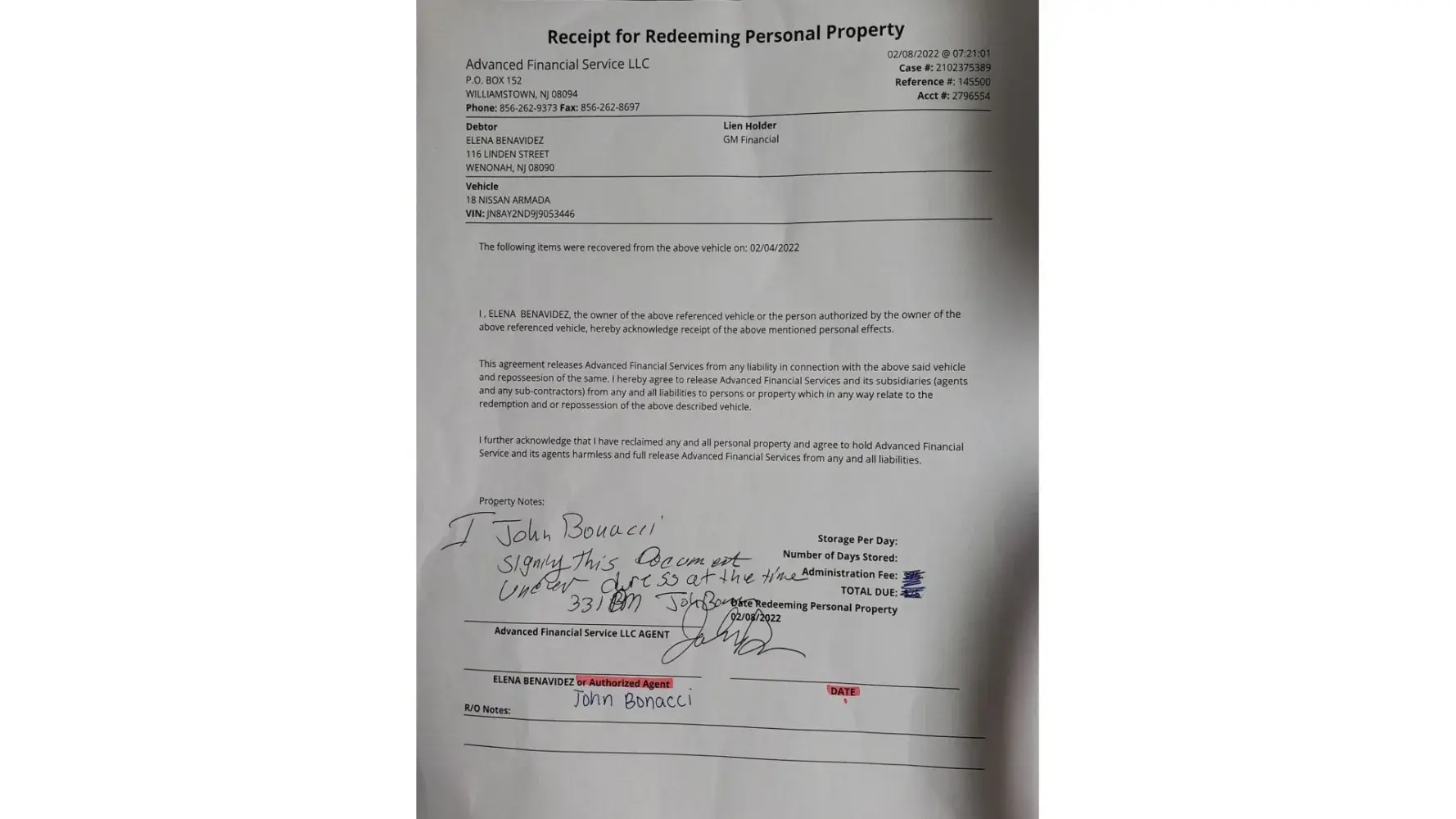 My name is John Bonacci, my address is 116 Linden St, Wenonah, NJ 08090, and we have had our 2018 Nissan Armada Platinum vehicle repossessed a few days ago.  My wife and I are both Government employees, Elena works work the Superior Court of New Jersey, and I'm a Retired Federal Air Marshal.  After I retired in 2015 I was given the opportunity to join the government program called Helmets to hardhats with the United Brotherhood of Carpenters Union.  We have been financially responsible and stable up until COVID-19 pandemic has engulfed our country.  Elena has had the opportunity to work from home for the courts, but myself as a union carpenter we rely on unemployment yearly as our income due to the nature of how the UBC works.  Unemployment has never been an issue except for a few weeks backed up, but after September 2021 the NJ Department of Labor, NJ unemployment, and the new fraud deterrent ID. ME to verify everyone claiming NJ Unemployment Insurance has backup the NJ unemployment for months.  Due to the unexpected disaster by not getting unemployment payments for 4 months even though there is a balance of $16,000.00, we have missed 67 days of payments approximately 2 months/ so 2 payments. Our family is patiently waiting for our lump sum of $16,000. by next week.