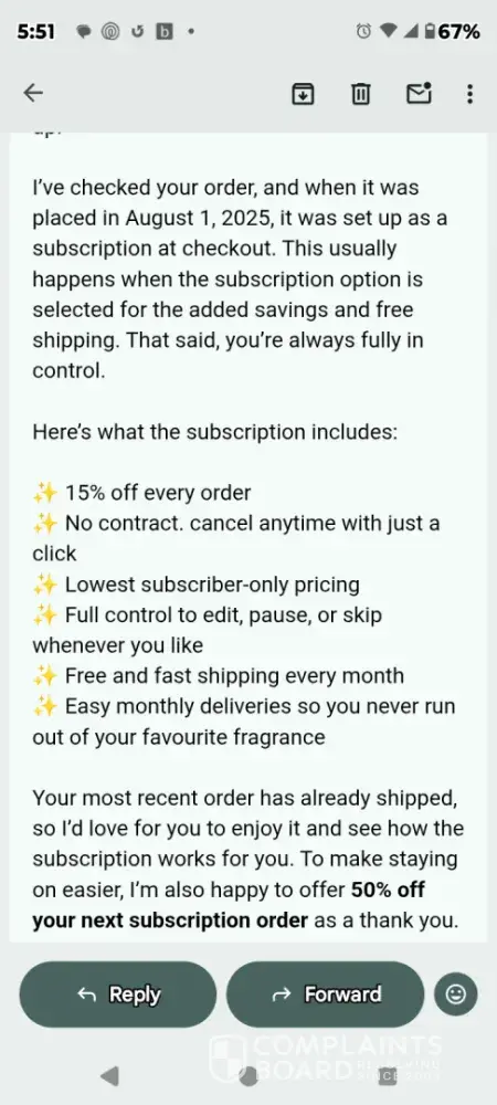 I placed my initial order on 09/17/2025 (order #GP666380) paid for and received the perfume. Since the initial order I have received two more bottles and was charged $34.00 each time. I figured I must have been tricked into inadvertently signing up for a subscription. I have emailed support@godaperfum.com at least 3 times, today being the third time asking...