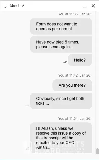 Jan 26th, still no change. Chat (back with Akash V) when he realised it was me, once again, he terminated the chat as soon as he could.