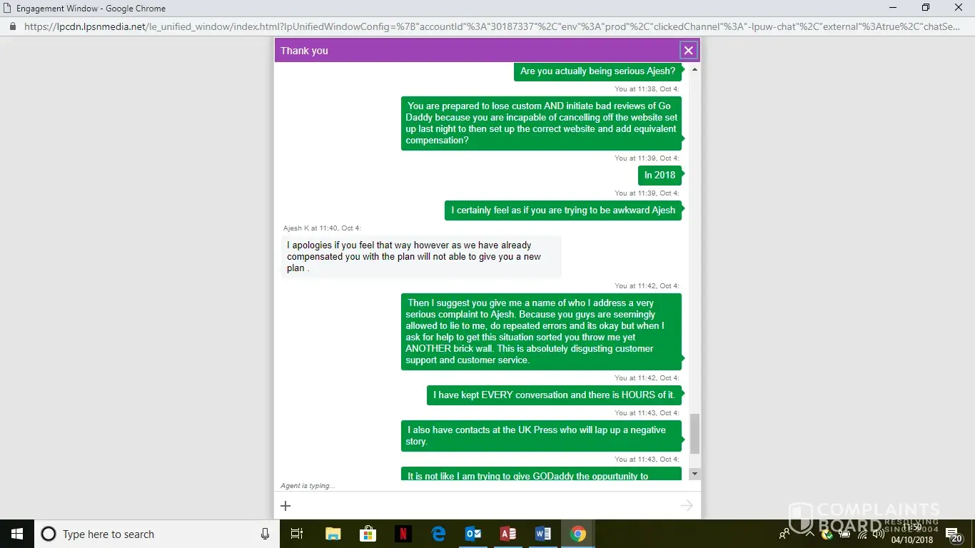 Then they forwarded my chat to some Ajesh K. Who is their supervisor as per them. He just shut the chat window on my face and left. What the *** I am supposed to do now. GoDaddy is just playing around with their customers' money.
