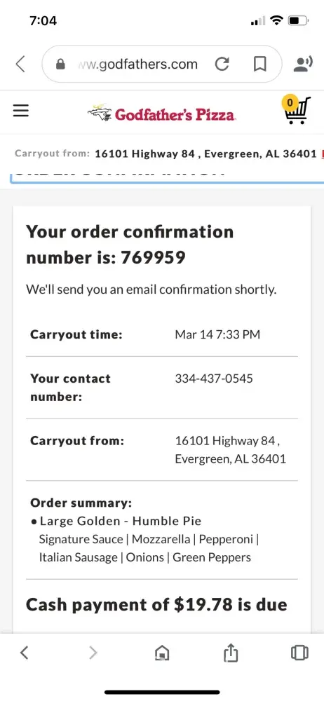 On 8/06/23 I ordered on line a pizza from Godfather’s Pizza at 4:06 at Loves Truck stop in Mt. Juliet Tn. The order was confirmed and I was told to pick up my pizza at 4:35. Went in to get my pizza and they didn’t have it ready because they never received the order but yet the money was already taken out of my checking account. I had to reorder and wait again for my pizza. I waited well over an hour. Wasn’t even offered a slice of pizza while I waited. Need to get some communication going…