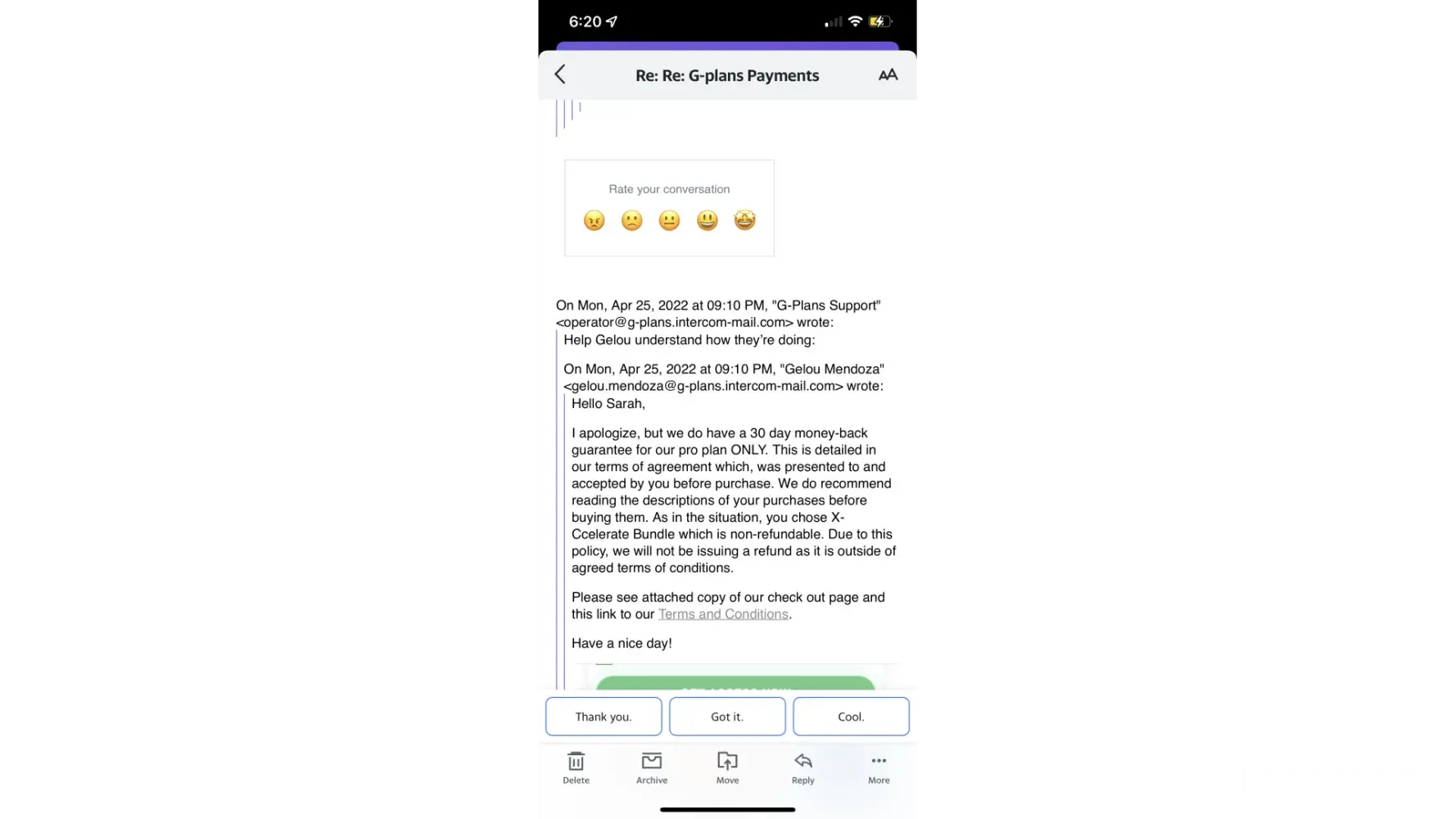 I’d been debating about trying g plans and decided against it, when I got an email saying something like “I won’t give up on you that easily†and offering a week trial free. I thought, couldn’t hurt.. put my payment info in and was charged just the $0.5 it warned me of. The issue is after seeing the meal plans and being underwhelmed, I was ready to cancel immediately— however I was met with a message saying I need to call to cancel since it’s the “power plan trial.†I call and the phone just rings and rings and rings. I leave a voicemail as prompted and send an email to support. I also replied to my “nutritionist and customer support†contact via email and explained the issue asking to have my trial cancelled. I’m afraid I won’t be able to do it before the week ends and will be charged a high fee I never wanted to pay. Desperately trying to explore all of my options before this happens! Based on a lot of reviews i’m now seeing, this company has a history of scammer behavior and funny charges.