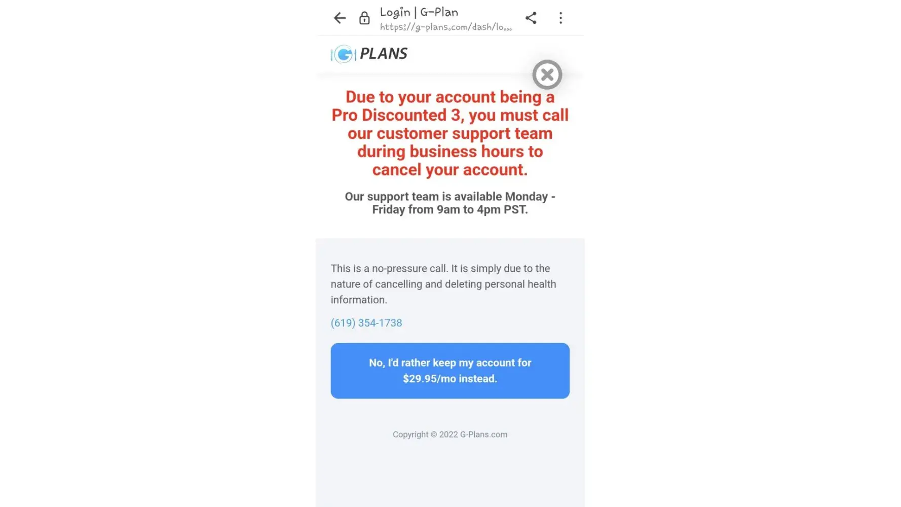 Desired outcome: I want to cancel my account with G Plans. Don't need refund, just want to make sure they stop billing me with immediate effect.
