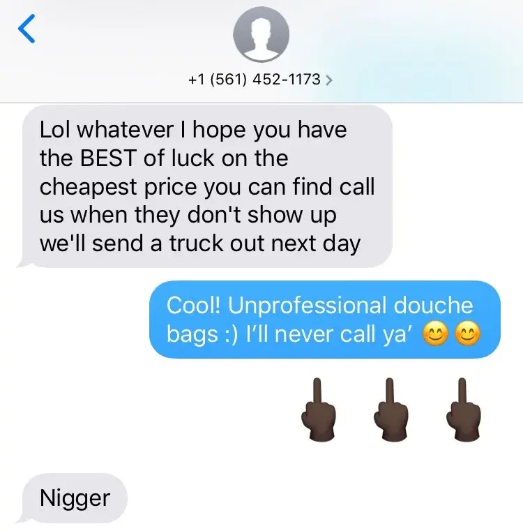 Most importantly they have a bunch of racist people on their staff and don't mind talking to potential customers any disrespectful way. One of the company's employees john healy - called me 27 times within one week, harassing me to book a move with the company like a telemarketer. Then, once I let him know I was uninterested, he proceeds to say on the phone "[censored]!" then text me sarcastic and racist remarks calling me the n word (see pics attached)! How is that professional conduct?!? The alleged "head" of the company john camp called me profusely apologizing, offering a discount but I have no interest in working with these scum bags. He said he would have his "human resources" department reach out about rectifying the situation and he also noted he would have the racist employee write me an apology email and receive disciplinary action.