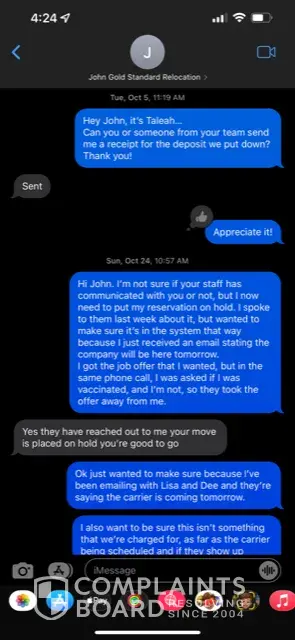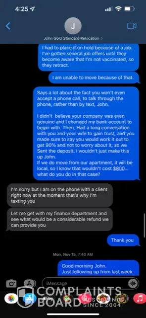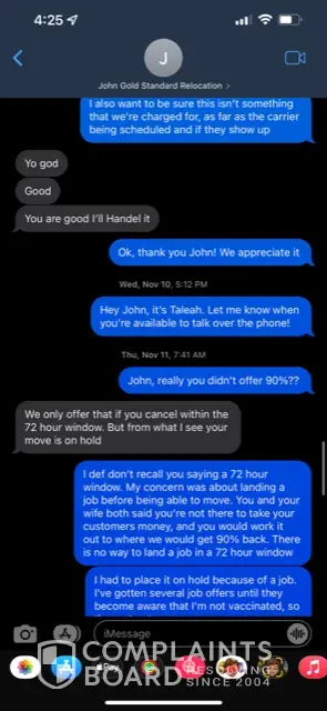 In Sept 2021, I was looking into moving services online. I put my info into a sight, and received numerous calls from many companies. One in particular reached out - Gold Standard Relocation. I spoke to John Campanella, who gave me great details, and the “best offer.†I wasn’t positive on any move at that moment, so he had Alicia V reach out to me and explain further, everything that is included in the move. She was nice, they both were. Were. After agreeing to the space and size of what I needed, I realized that I couldn’t rely on the given space versus the amount of money it would cost with the initial quote, as I felt like I shouldn’t have to get rid of any of my stuff just to fit in the size offered, or in boxes, as we all have stuff that won’t fit in standard boxes. I had already given my bank account information to have the deposit charged, to hold the spot/amount, in the amount of $810.21, as they ONLY accept bank account wire, Direct payment into COMPANY account, or credit card with an additional 3% fee. So I chose bank account. I then started doing more research and found out about this company more, and freaked out, thinking they were going to scam me for all the money I just paid. The reviews are terrible, and I didn’t want to be charged all these extra fees that I wasn’t told about, and for my stuff to be ruined, broken, stolen, or literally held hostage. I needed to know flat out, what I was getting myself into. So, I called my bank and closed my bank account before they could charge me. I then sent a message to Alicia (by the way her name is spelt differently via text versus what they have her listed under the company. When I asked about that, I was told the manager misspelled her name — - I should have taken that as a reg flag also!) I wanted to let her know that I’m not going through with the moving company as I didn’t feel comfortable. She then had John Campanella reach out to me via text to reassure me that my rate would stay the same, and more space would be given for my move. I still felt uneasy. He wanted to reassure me that 90% of the bad reviews were for another company that supposedly used the same name - weird! He didn’t want me to be “alarmed†with any of the reviews as he is in litigation with the other company that gave them a “bad reputation.†This is when I learned that this company are brokers, not the actual moving company. Something they decided to leave out up front. Had I known that up front, I would have walked away right then. These people are salesmen, they know how to sweet talk to make you trust and believe them. Trust me, this gets even better (worse really). I then started getting the back and fourth with John having a hard time reaching him. He is full of excuses! In a meeting now, sorry productive day, Driving now, Taking my 7 year old to Dave and Busters and can call later. John finally calls on the night of Wednesday 9/29/21 At 7Pm my time. I’m in California and he is in Florida, so quite the time difference. So, just a bit unprofessional! Also, I have all the text messages to prove these conversations and I will add them to my complaint. During this phone conversation, I had my mother present on speaker, while John Campanella and his wife Shannon Campanella were on the other end. Now I am informed that she too, works with this company. We all had a great conversation, and they again earned my trust. We had personal conversations even, about our dogs which is why we shared pics, about the current political issues/ covid going on in the world. I guess they probably do this to be relate-able, and seemingly trustworthy. I also sent pictures of my furniture to get a better idea of the amount of space needed. I made it VERY clear to John and his wife that because of covid, I am unsure that I will be able to land a job, prior to moving (my plan was to move to Colorado), and if I can’t land a job, then I can’t move. I was reassured by the both of them that they are not here to take their clients money. They will put my move on hold. If I can’t land a job then they would be sure to get me 90% of my deposit back. I made sure to reiterate that because that is a lot of money to lose and I can’t afford that, nor want to just throw money away, if I am unable to use their services. They made it clear that they wouldn’t just take my money. The other factor was that I didn’t feel comfortable giving my bank information again, and I don’t want to pay 3% more to use my credit card. So, Shannon offered for me to make my deposit payment to her PERSONAL venmo account (contract breach right here) which I had no idea they couldn’t do that until I went to get my deposit back, and found this in the fine print. Therefore, they are willing to make a breach in their contract when it benefits them, but not to give me my deposit back, when NO SERVICES WERE USED! Going forward, I received an email from the moving company on Oct 24th stating they would be there the following day, which I had called standard relocation a week prior to put the move on hold since I was offered a job and then it was taken away from me, because I chose not to be vaccinated. This is the issue I explained to John and his wife Shannon, that could happen to me. John stated via text that it was on hold and I was good. Nov 10th, I asked John to call me because I spoke to Standard relocation letting them know I’ll just need to set up for a refund as I will not be able to move. Several jobs offered a position for me, but retracted due to the vaccine mandate. I was told by the rude manager Samuel who told me that John never said anything about a refund because he would have written it down, as if I was a liar. Samuel was so rude, had no compassion, no empathy, simply did not care, and said they could only give me 10% refund. That is $81 of $810! This is when John turned on me, and changed his word, and stated they only give a 72 hour window for a 90% refund