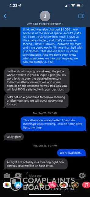 Gold Standard Relocation and I came to an agreeable resolution to my complaint. My part of the agreement is to remove all negative reviews/complaints where I can, or at least note Gold Standard Relocation's efforts to make the situation right (per me, the customer). I appreciate GSR's efforts in this regard. PH
