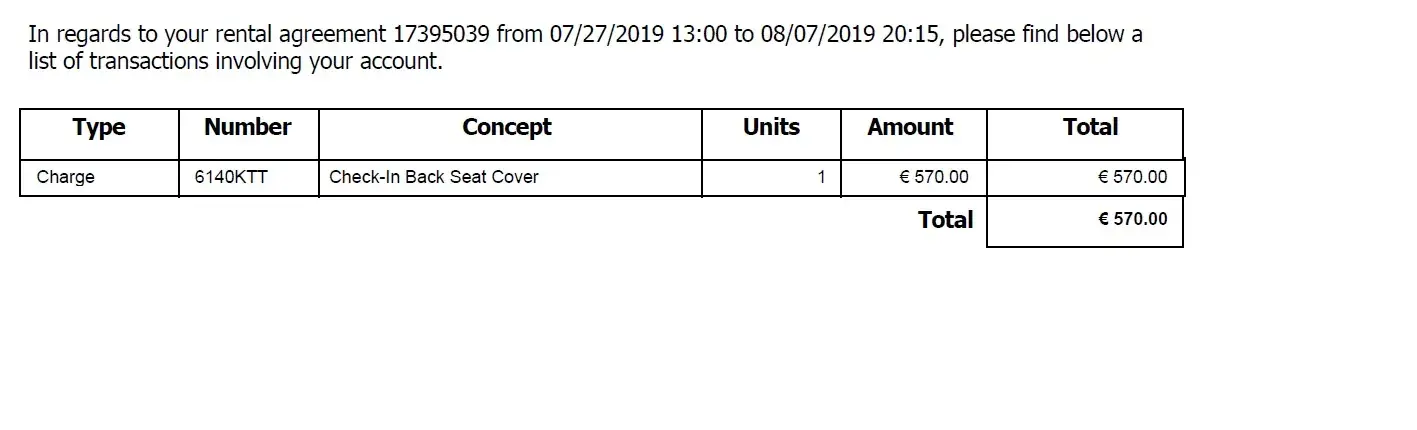 I received the documents from Goldcar par mail which show that they were not additional charges at the end of the renting period and also the operation between my bank account and Goldcar.
