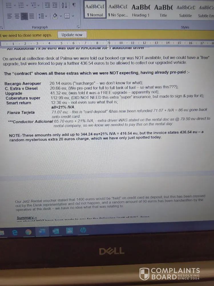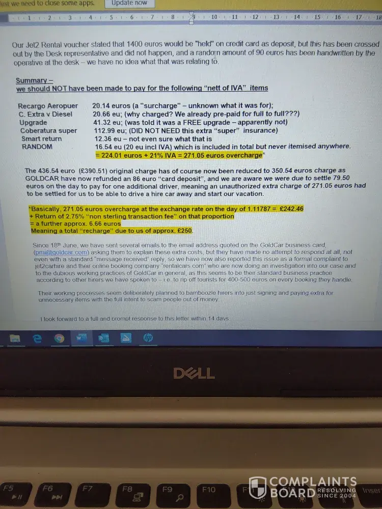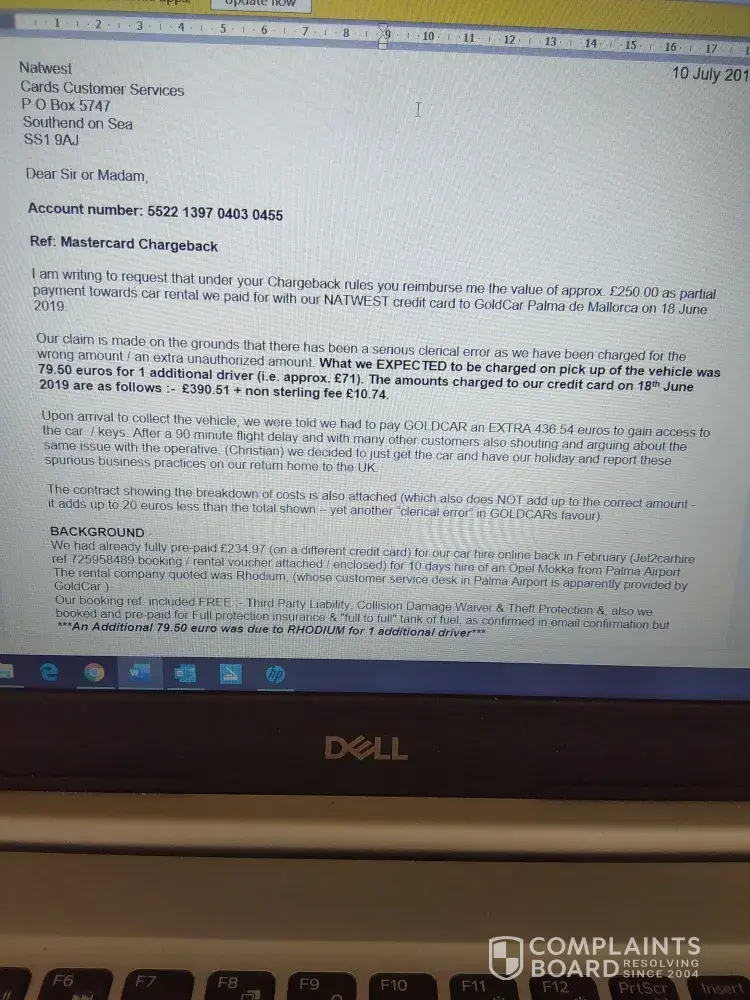 Complaint is made on the grounds that we were forced to pay an extra 436.54 euros to be allowed to collect our hire car, having already pre-paid for the hire online in the uk through jet2carhire.com. (booked with rhodium, whose desk at palma is operated by goldcar.
