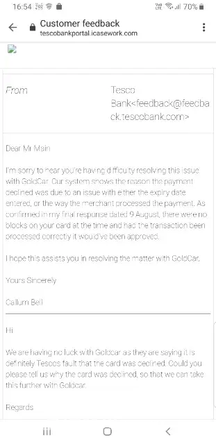 When the card transaction was attempted it was declined. We then had to come out of the queue and called our bank (TESCO Bank) to clarify the situation. We were advised that there was no issue at the bank at that the issue was with GoldCar.