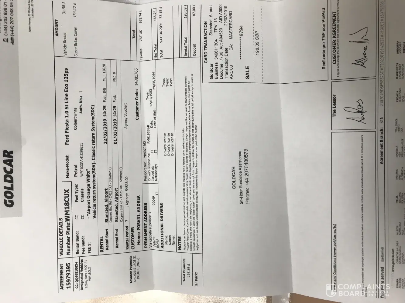 When I delivered back the car at Stansted office I adviced the operator at Goldcar office to have received a wrong penalty charge on February 28 at 21:45. The operator scanned the Parking charge notice and I sent at the same time the proof of payment made via paybyphone.co.uk . I've been reassured nothing more was due from my side. Despite of this I received a penalty charge of 100 GBP from Goldcar in April which is not due.
