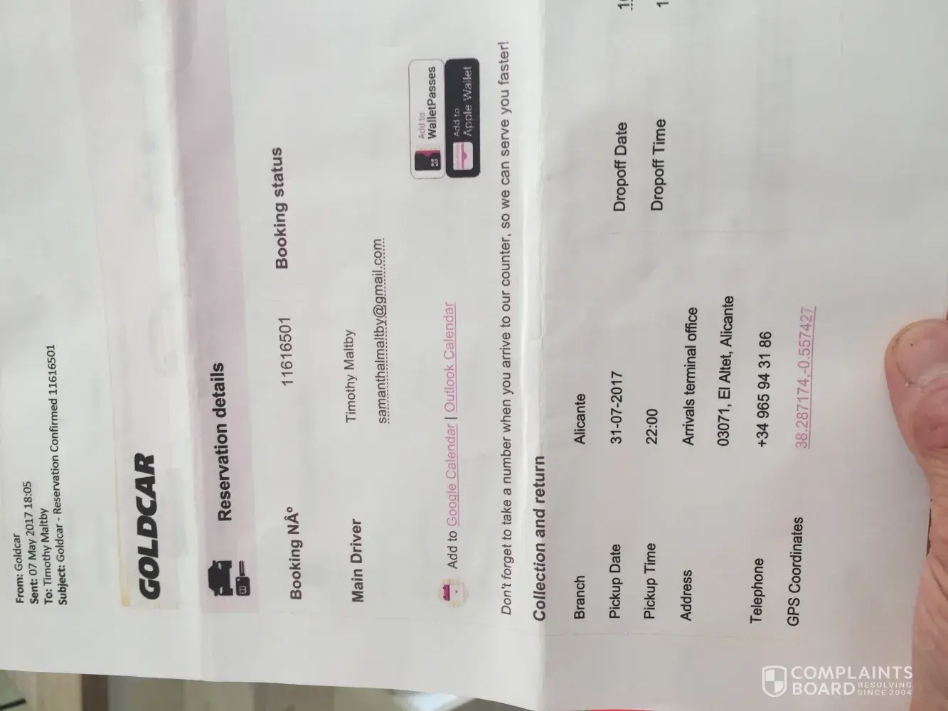 Good morning, we recently returned from Spain. Prior to our holiday we booked car hire through Gold Car for our ten day stay, receiving confirmation via email of our booking .