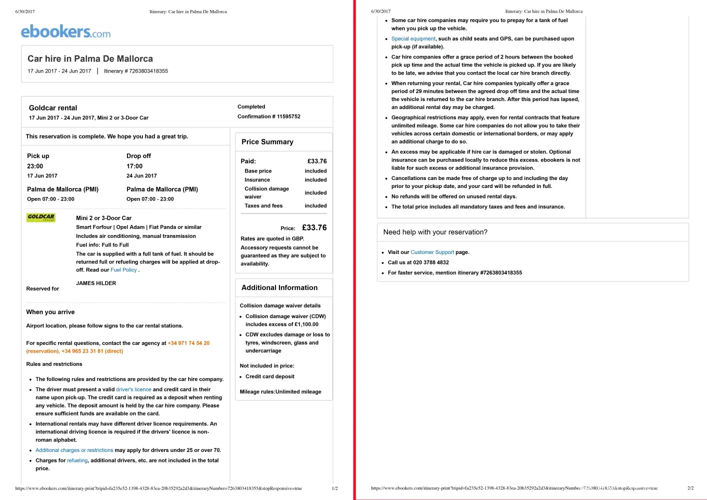 Contact No. [protected] - Rental from 5th July to 19th July. Upon picking the keys up at the rental desk in Mallorca Airport, a discussion was had regarding insurance. I explained to the assistant who was serving me that I had a 'Damage Excess' policy which had been specifically bought prior to traveling to Spain. I was told by the assistant 'the insurance...