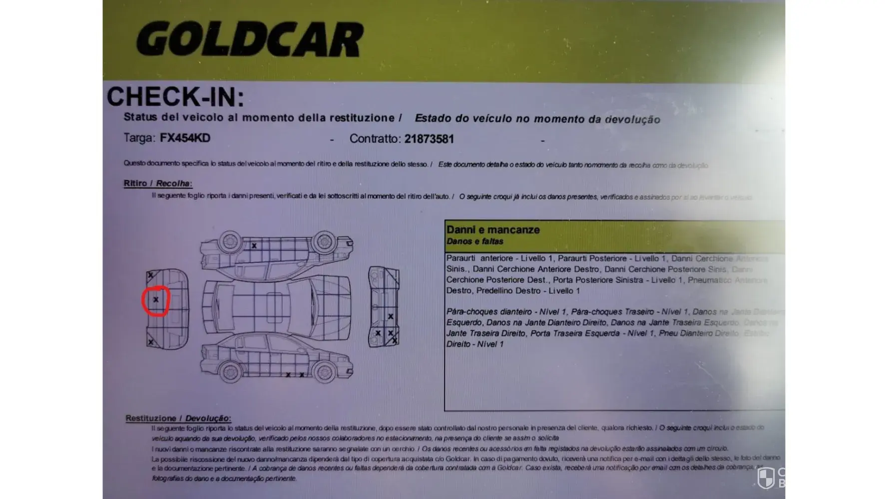 Goldcar states that the damage is new but the truth is it didn't marked any new 'x' on the sketch they sent to justify their charge. Goldcar’s check-in (“doc3â€) and check-out (“doc2â€) documents report marks exactly the same 'X', proving that the damage we are accused of was already there when we picked up the car.