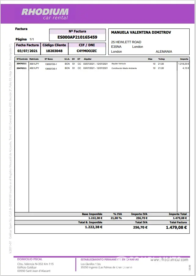 I rented a car between 03/07/2021 and 12/07/2021 with Goldcar/Rhodium. The original amount quoted was 798, 22€, the final amount charged was 1222, 38€. When I made the reservation, I had entered the exact details of the rental (pick up in Barcelona, return in Toulouse) and had even contacted their customer service team to confirm that the quote indeed captured any additional charges for cross-country car rental. Despite multiple requests for a detailed invoice breakdown to understand what I have been charged for, I have only received the attached invoice containing two positions. I have contacted both Goldcar and Rhodium customer service multiple times with a request for resolution - Goldcar only kept on sharing the same invoice missing any kind of detail, Rhodium kept on kicking me out of their customer service chat whenever they found out that I contacted them with regards to this specific enquiry.