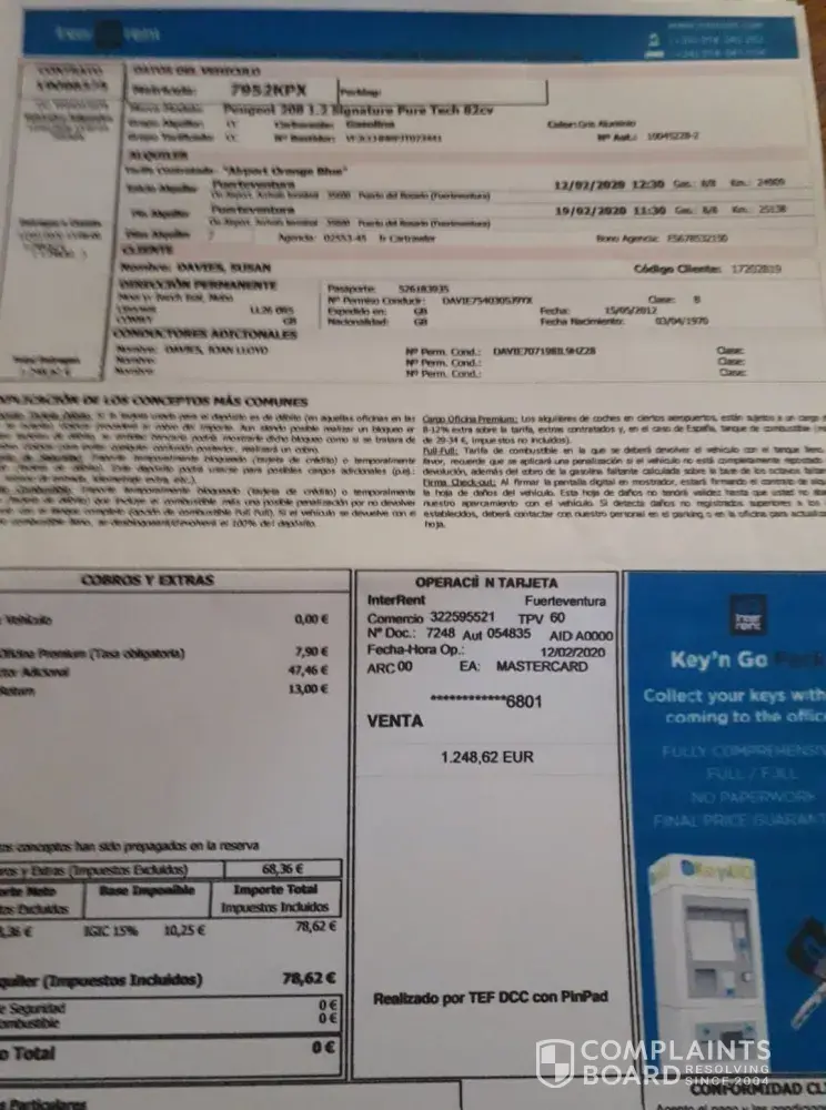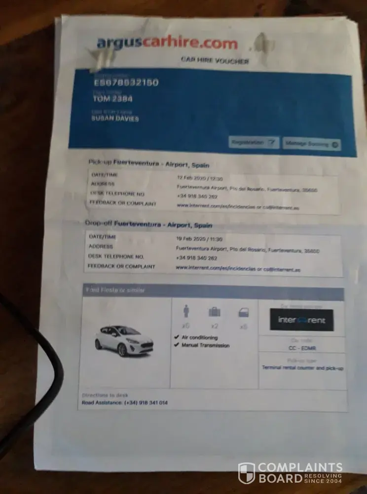 12.02.2020 - collected hire car from Fuertaventura InterRent kiosk at Fuertaventura Airport - credit card details were taken and told that £1, 100 pounds would be taken as a security deposit. Aggressively persuaded that I had to pay €160 for additional insurance, which we declined, also told that there was no 'additional driver' on the contract and told that would cost us €7/day - declined this (on checking booking documents from ArgusCarHire, found that we did have additional driver on the booking, InterRent insisting that we didn't!)