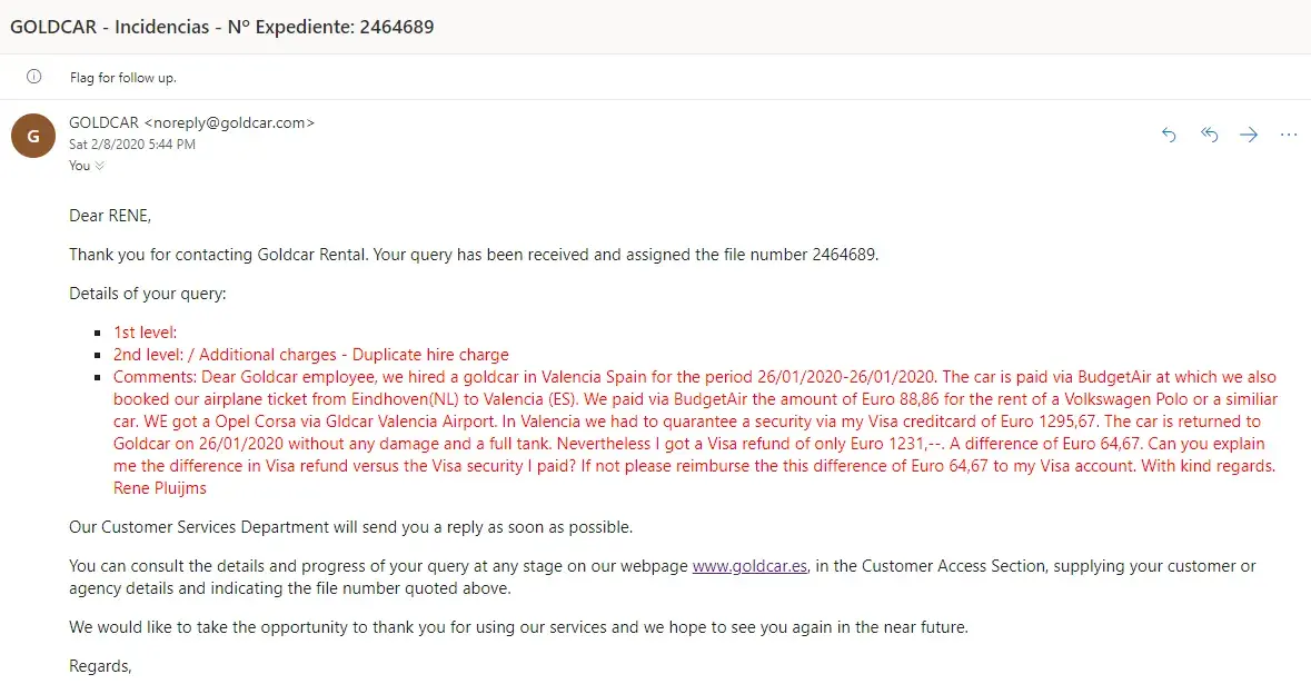> The Goldcar employee promised me to send a copy of this e-mail to my by Goldcar known e-mail address : [protected]@pluijms.tech.