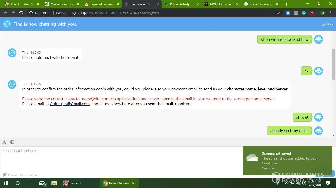 May I have your payment email address and character name please?