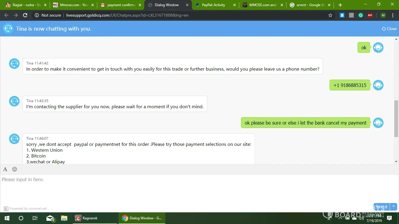 I attempted 3 times to live chat and either get the gold they charged me for, or a refund. Each time I was simply told that they do not accept paypal as a payment (its on their website as 3 different payment options) and if I wanted a refund I would have to purchase through western union for a second transaction (even though i never actually made a purchase) to get a refund. I threatened them with filing a case against them with paypal, same response. I was hung up on, at no point did I ever curse or escalate, still hung up on me.