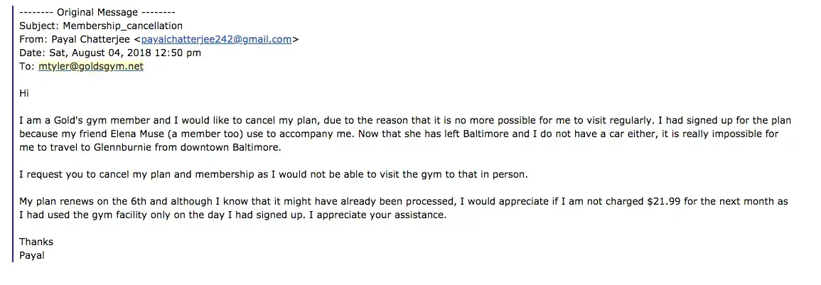In June of 2017, I new I was going to have to go up North for family the following month. I tried three times (at two different gyms) to cancel my membership before I left, but each time I went in, I was told that there was not anyone available who could cancel my membership. I wound up leaving earlier than expected. Upon being in rural Massachusetts, and realizing I would be there longer than expected, I called to cancel my membership, whereupon I was told I could not cancel over the phone. Time went by, I tried calling again and explaining the situation, where I was again told it had to be in person.
