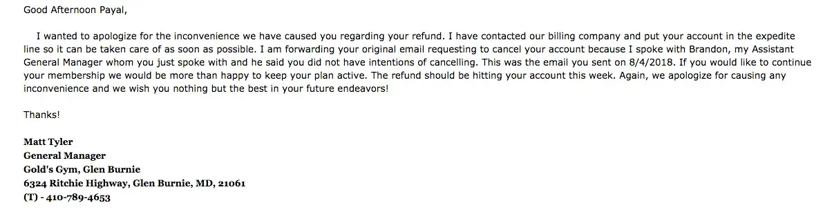 I registered myself on the 4th of July for membership in Gold's Gym located at 6324 Ritchie Highway Glen Burnie, MD, 21061. As an offer I was waved for the first month and was not charged for the month of July. However, I had to cancel my membership for the month of August. I called the gym on August 4th through email and phone for canceling my membership but could not reach out to them before August 6th. Since my account was already charged by this time, I accepted my fault and asked for the membership cancellation the same day to the manager Matt Tyler. He assured that my membership was canceled and that although I had to pay for the month of August, my account would not be charged anymore and thereafter!
