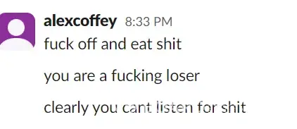 After the shift ended on the 15th, I reached out to Alex and asked him when would payment be disbursed. I reached out by text first then by a voice call. He answered and I asked, "Hey Alex, could you say what time payment would be disbursed today?" and his response was "WTF? Don't you ever call me again you black [censored], [censored] off" and disconnected the call. He then texted Anthony and told him to fire me.